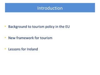 The document discusses the European Union's tourism policy and its implications for Ireland. It outlines that the EU now has a legal basis for tourism development following the Lisbon Treaty. The EU framework aims to boost competitiveness, promote sustainable tourism, and maximize financial support for the sector. For Ireland, it recommends developing a strategic plan to make Ireland "the best small country for tourism." It also suggests Ireland use its upcoming EU presidency to prioritize tourism funding and address the sector's fragmentation and lack of long-term strategic planning.