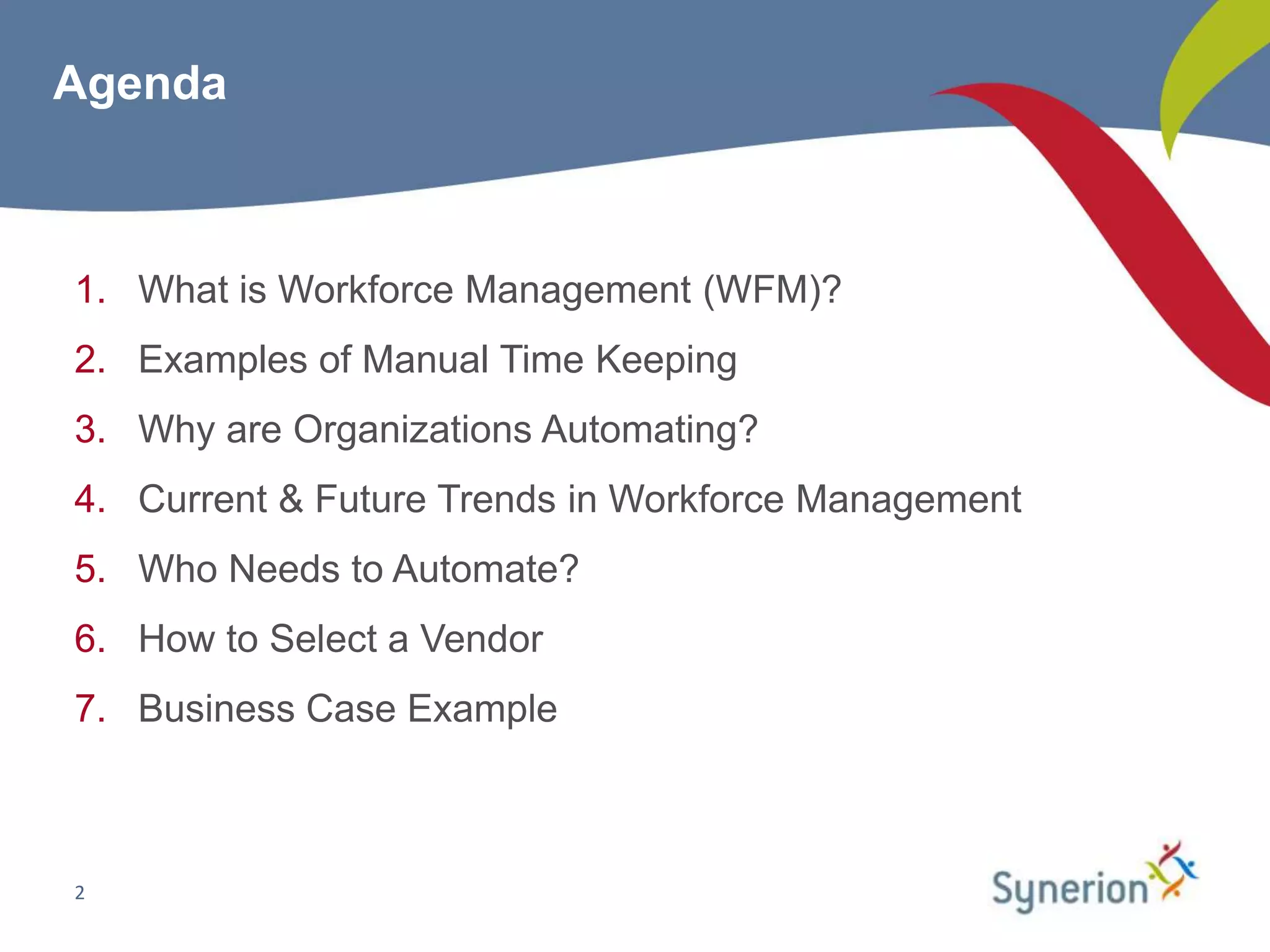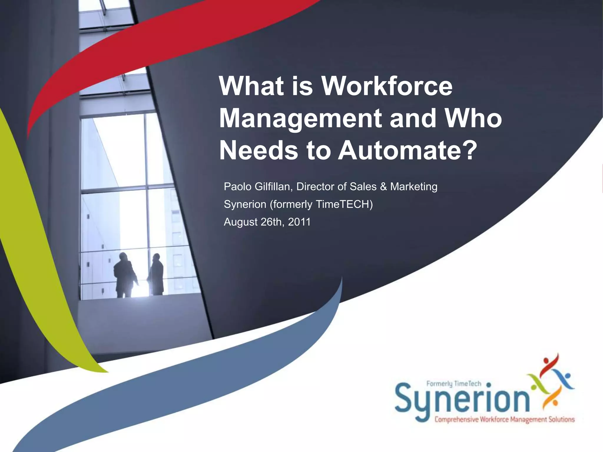 This document discusses workforce management (WFM) and the benefits of automating manual timekeeping processes. It defines WFM as encompassing all activities needed to manage a workforce, including planning, forecasting, scheduling, and tracking workers. The document provides examples of manual timekeeping processes and their limitations. It argues that automating can provide cost savings through reduced errors, increased productivity, and improved decision making. The document also discusses current and future trends in WFM, who should consider automating, and how to select a vendor and define a business case. It provides a hypothetical example of a business case that estimates over $600,000 in annual hard cost savings from automating.