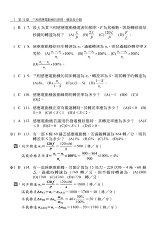 ※( C )17. 一部 8 極 60 赫芝的三相感應電動機,若滿載轉速為 864 轉/分,