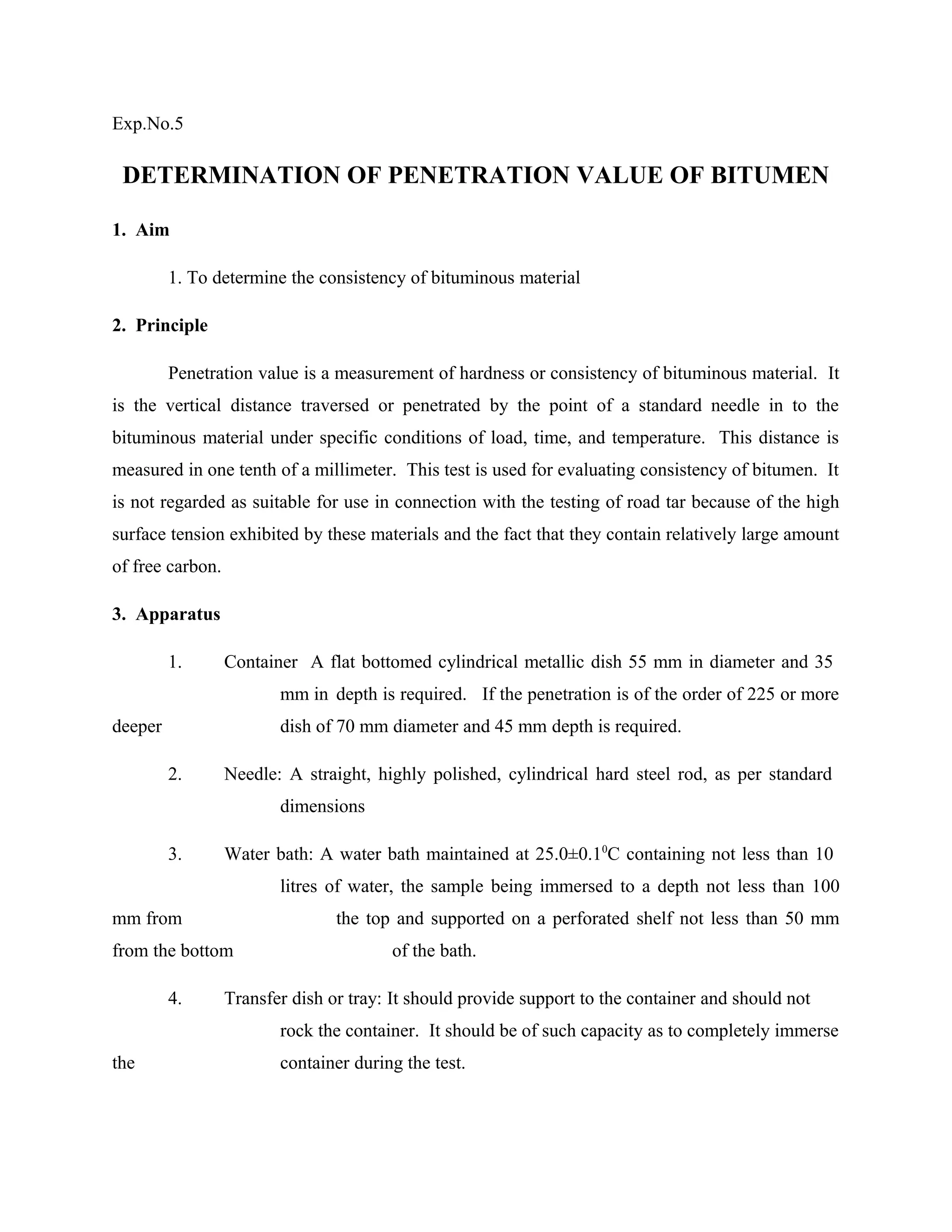 The document describes procedures for determining various properties of bituminous materials including penetration value, softening point, ductility, and viscosity. The penetration value test measures the hardness or consistency of a bituminous material by the distance a needle penetrates into a sample under specified conditions. The softening point test determines the temperature at which a bitumen or tar sample reaches a specified softening level. The ductility test measures the distance a bitumen sample will elongate before breaking when pulled apart at a specified speed and temperature. The viscosity test determines the time taken for 50mL of a bituminous material to flow through a specified orifice at a given temperature, providing a measure of its resistance to flow.