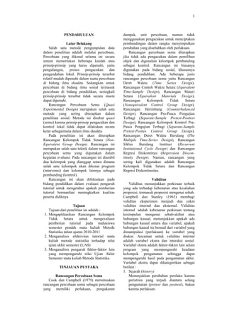 Dokumen ini membahas rancangan percobaan semu dalam penelitian sosial, termasuk tantangan untuk validitas internal dan eksternal. Metode yang digunakan meliputi analisis regresi linear berganda untuk menganalisis faktor-faktor yang mempengaruhi nilai ujian akhir mahasiswa. Tujuan penelitian ini adalah untuk mengevaluasi efektivitas tutorial dalam meningkatkan prestasi belajar mahasiswa dan menghimpun data dari populasi mahasiswa dengan kriteria tertentu.