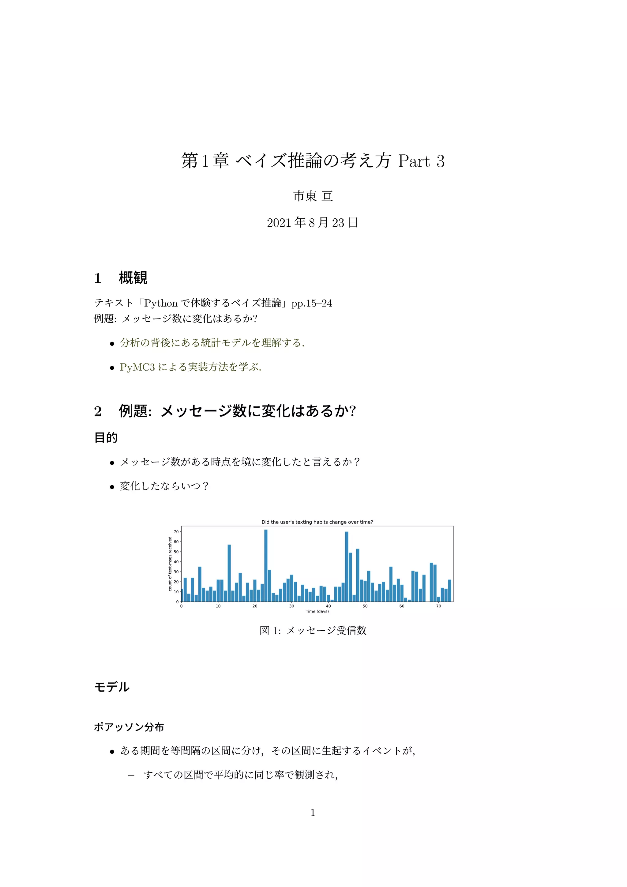3 市東 亘 2021 年 8 月 23 日 1 概観 テキスト「Python で体験するベイズ推論」pp.15–24 例題: メッセージ数に変化はあるか? • 分析の背後にある統計モデルを理解する. • PyMC3 による実装方法を学ぶ. 2 例題: メッセージ数に変化はあるか? 目的 • メッセージ数がある時点を境に変化したと言えるか? • 変化したならいつ? 0 10 20 30 40 50 60 70 Time (days) 0 10 20 30 40 50 60 70 count of text-msgs received Did the user's texting habits change over time? 図 1: メッセージ受信数 モデル ポアッソン分布 • ある期間を等間隔の区間に分け,その区間に生起するイベントが, – すべての区間で平均的に同じ率で観測され, 1
