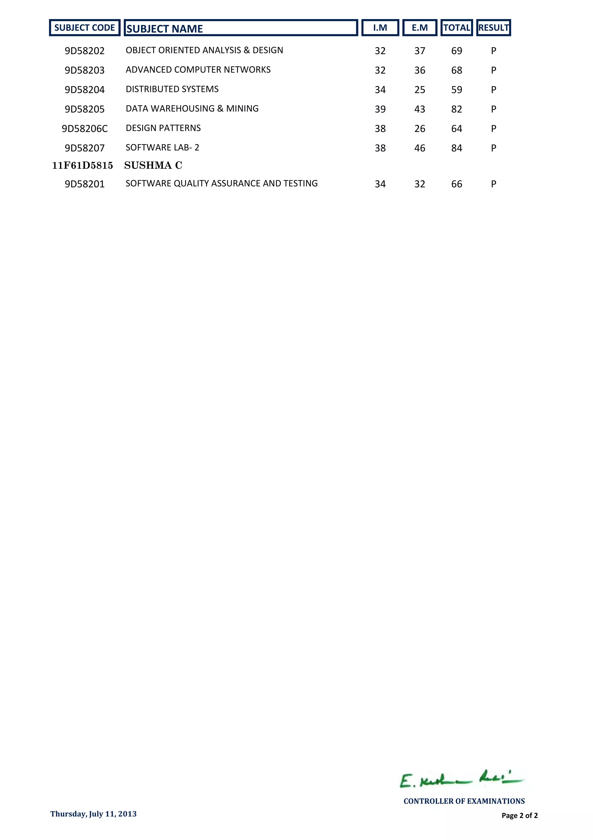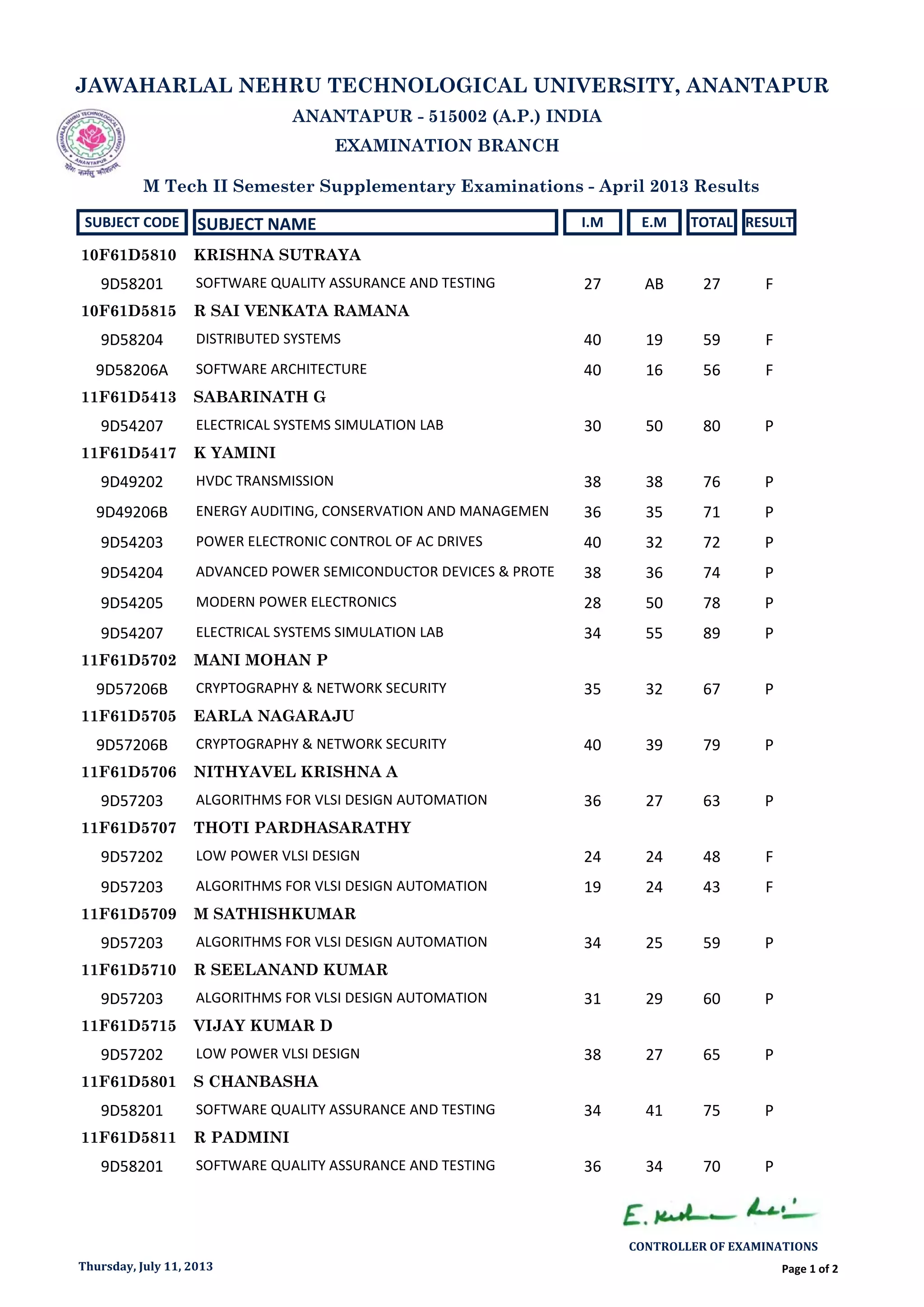 This document contains the results of M Tech II Semester Supplementary Examinations held in April 2013 by Jawaharlal Nehru Technological University, Anantapur. It lists the subject codes, subject names, internal marks, external marks, total marks and results for various students. The results range from pass to fail for subjects like Software Quality Assurance and Testing, Distributed Systems, Electrical Systems Simulation Lab, Cryptography & Network Security, Low Power VLSI Design, Algorithms for VLSI Design Automation, and others.
