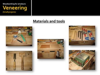 The document provides instructions for veneering a small cabinet panel using Honduras mahogany veneer. It describes preparing the materials, including the mahogany veneer and beech frame. It then outlines the gluing process using a special veneer glue and roller, pressing the panel overnight, and removing excess veneer using chisels and a table saw. The detailed steps and accompanying diagrams provide a concise tutorial for veneering a small woodworking project.