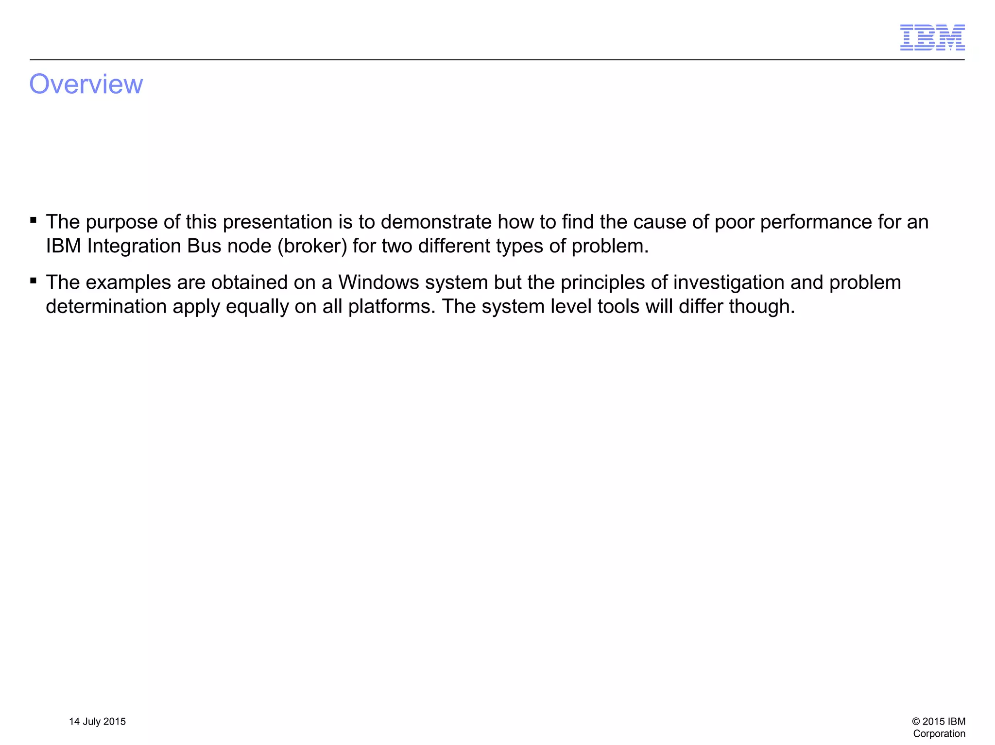 This document discusses tools and techniques for analyzing system performance and throughput issues in IBM Integration Bus V10. It provides an overview of the Integration Bus architecture and components. It then describes various tools for monitoring resources, workload generation, and analyzing performance at the operating system, component, and message flow levels. These include tools like Process Explorer, WebUI statistics, MQ Explorer, and Java Healthcenter. The document concludes with an agenda to demonstrate analyzing two types of performance problems using these tools.