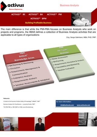 The document discusses the differences between the PMI-PBA and IIBA certifications for business analysts, highlighting that the PMI-PBA focuses on analysts in projects and programs while the IIBA encompasses a broader range of business analysis activities for various organizations. It references key sources such as the BABOK and provides contact information for further queries. The document aims to inform practitioners about these certifications and their applicability.