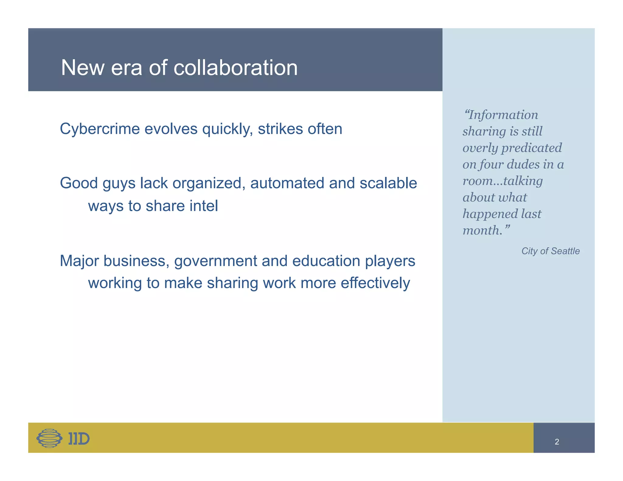The document discusses the need for collaboration among security experts to combat cybercrime, highlighting the obstacles of trust, liability, and resource limitations. It emphasizes the importance of proactive measures, incident response, and post-attack inquiries while calling for standardized processes and trust-building among collaborators. The conclusion stresses the significance of advancing cybersecurity intelligence sharing to keep pace with evolving threats.