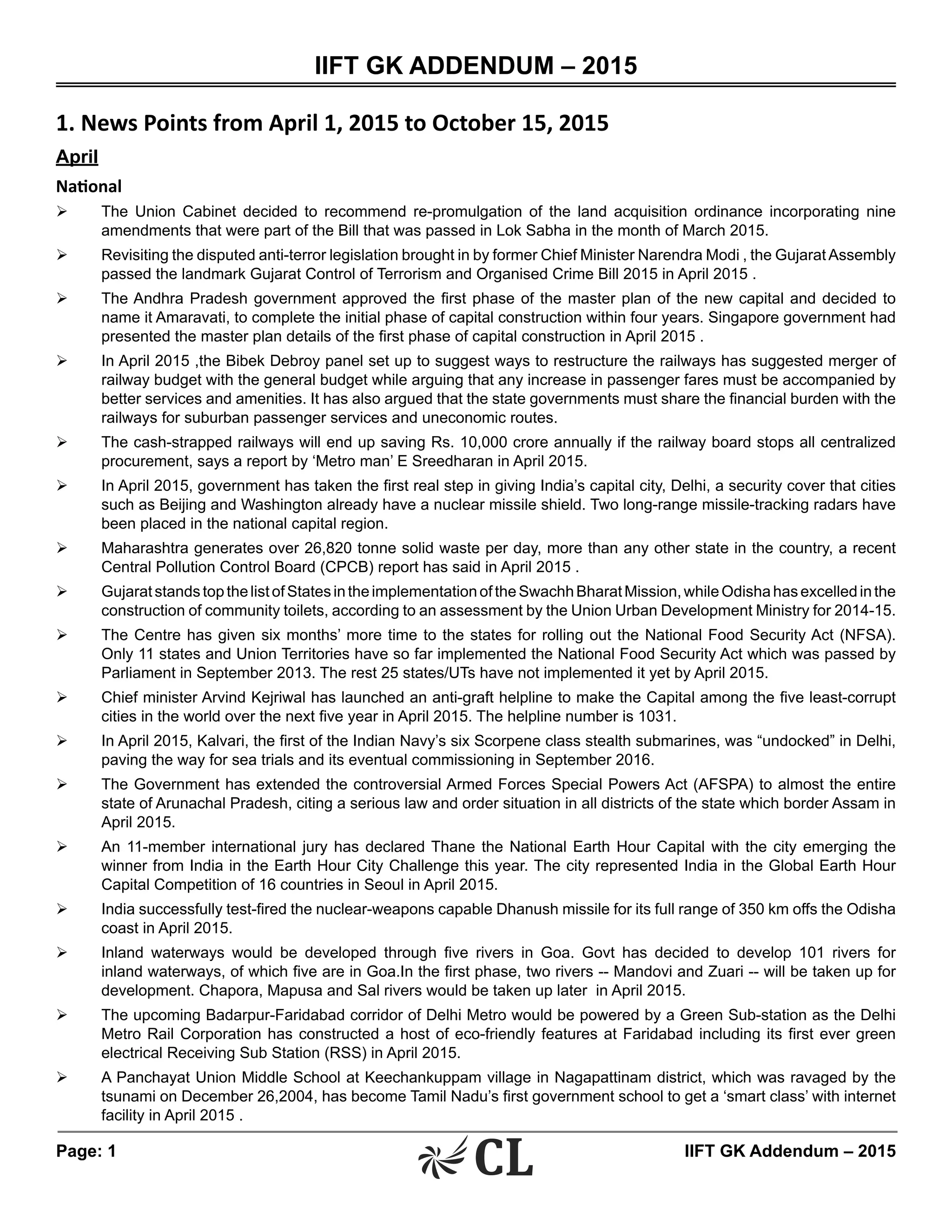 This document serves as an addendum for the IIFT 2015 examination, providing essential updates and additional knowledge relevant to candidates. It includes important news from April to October 2015, covering various topics such as governmental decisions, economic developments, and international relations. The addendum aims to enhance the existing GK compendium and support students in their exam preparation.