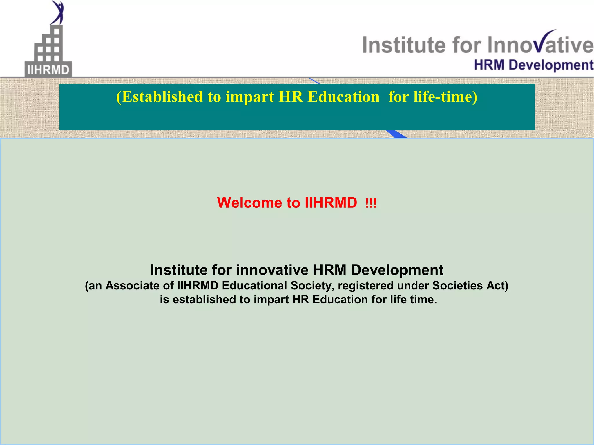 The document is about the Institute for Innovative HRM Development (IIHRMD), which was established to impart lifelong HR education. It provides information about IIHRMD's vision, locations, programs offered, and faculty. The key programs discussed include a certification course in corporate HR practices offered on weekends or through distance learning. The document promotes IIHRMD's programs and faculty while providing details about courses, schedules, eligibility, and fees.