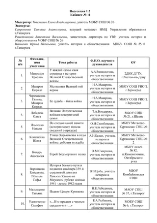 Документ представляет программу III межрайонной конференции студентов и школьников на тему 'Региональная история Великой Отечественной войны', включает различные секции и подсекции, модераторов и экспертов. Участники представляют учебно-исследовательские работы, касающиеся значимых событий и личностей войны, включая темы об авиации, письмах с фронта, пропаганде и мемориалах. Основное внимание уделяется индивидуальным и коллективным вкладом в изучение и сохранение исторической памяти о Великой Отечественной войне.