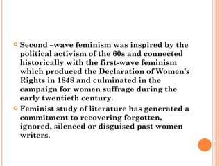 Second-wave feminism in the 1960s-70s focused on recovering works by forgotten women writers and exploring how literature by male authors portrayed women. Influential works included Kate Millett's critique of Freud/Lawrence, and Gilbert and Gubar's "The Madwoman in the Attic" which analyzed how 19th century women writers had to negotiate oppression and psychological distress to achieve literary authority. New French Feminism celebrated feminine discourse to challenge patriarchal constructs of gender difference. Later critiques argued the movement overemphasized female victimization and ignored factors like class, ideology and non-white women's experiences.