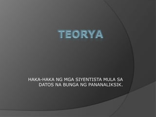 Ang dokumento ay naglalahad ng iba't ibang teorya tungkol sa pinagmulan ng daigdig, mula sa mga teoryang maka-agham tulad ng nebular at big bang theory, hanggang sa mga teoryang biblikal na nakabatay sa Genesis. Isinasalaysay nito ang mga proseso at ideya ng mga siyentipiko at mga manunulat ng bibliya hinggil sa paglikha ng mundo at tao. Pinaabot ng dokumento ang mensahe na sa kabila ng pagkakaiba-iba sa mga teorya, ang bawat isa ay may halaga sa pag-unawa sa ating paglalakbay sa buhay.