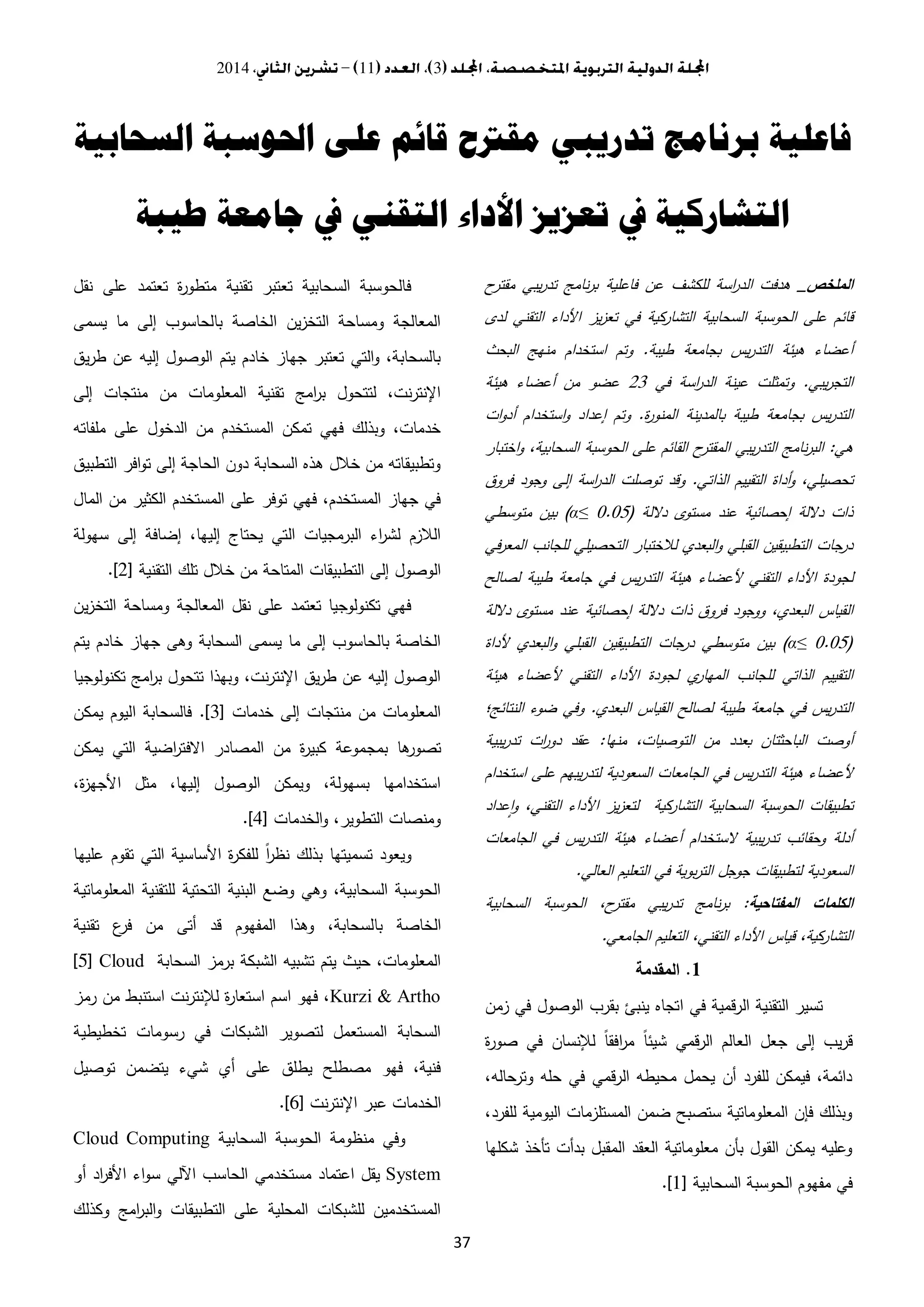 تهدف الدراسة إلى الكشف عن فاعلية برنامج تدريبي مقترح قائم على الحوسبة السحابية التشاركية في تعزيز الأداء التقني لأعضاء هيئة التدريس بجامعة طيبة. أظهرت النتائج وجود فروق ذات دلالة إحصائية بين درجات الاختبار التحصيلي والقياس الذاتي قبل وبعد التطبيق لصالح القياس البعدي. أوصى الباحثون بعقد دورات تدريبية لأعضاء هيئة التدريس في الجامعات السعودية لتعزيز استخدام تطبيقات الحوسبة السحابية.