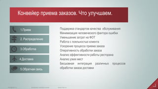 Документ описывает оптимизацию службы доставки и включает в себя улучшения в процессе приема, обработки и доставки заказов. Основное внимание уделяется автоматизации, интеграции систем и повышению эффективности работы операторов и курьеров. Приведены данные о зарплатах, производительности и финансовых выгодах от внедряемых решений.