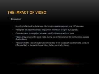 The document discusses the significant impact of video content on consumer engagement, conversion rates, and brand perception, emphasizing that video increases engagement by 100% on social media and leads to higher ROI. It outlines metrics and adoption rates indicating a growing trend in video usage among advertisers and brands, with predictions of video ad spending doubling in the coming years. Additionally, the document introduces IIL Media, a full-service video production firm, highlighting their services from concept to post-production for corporate and marketing needs.