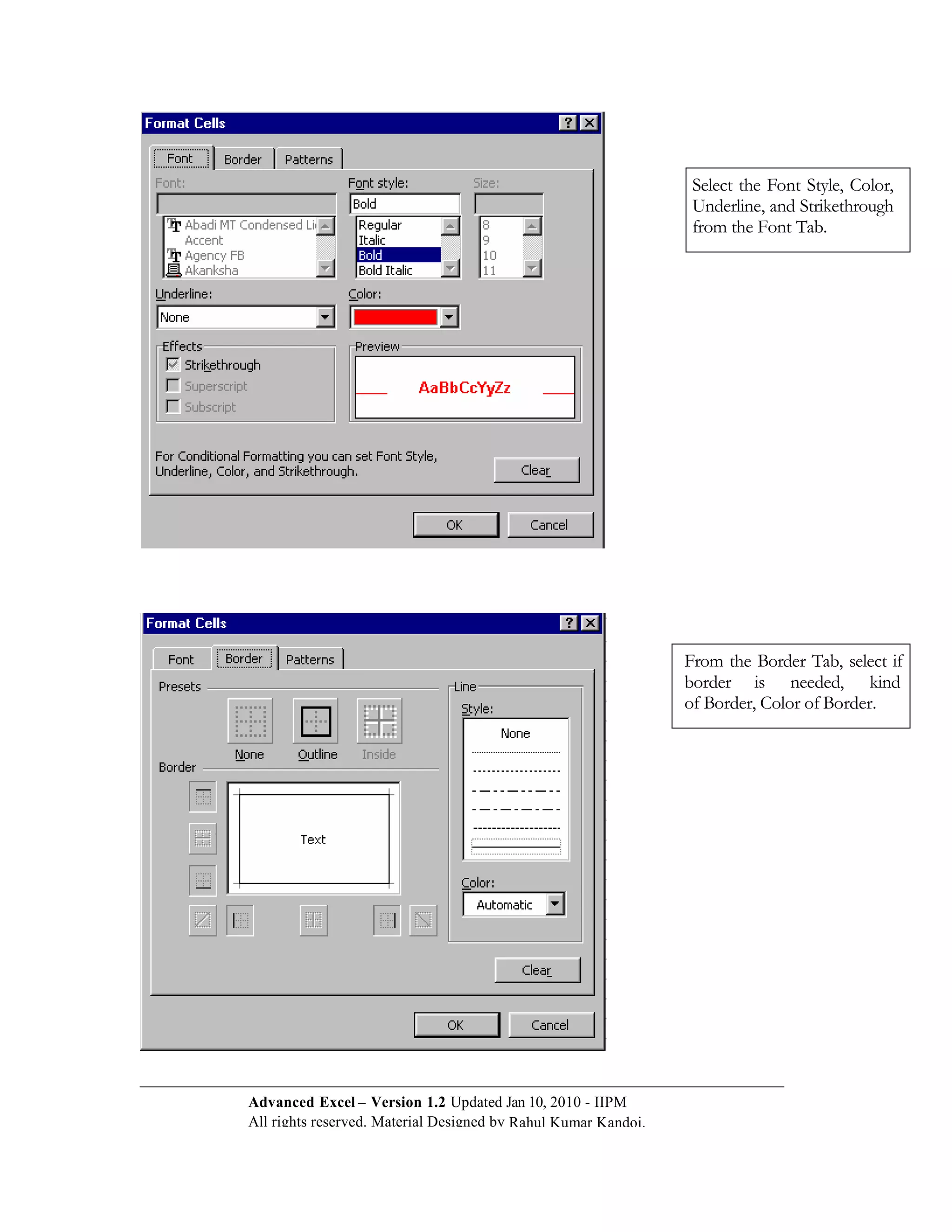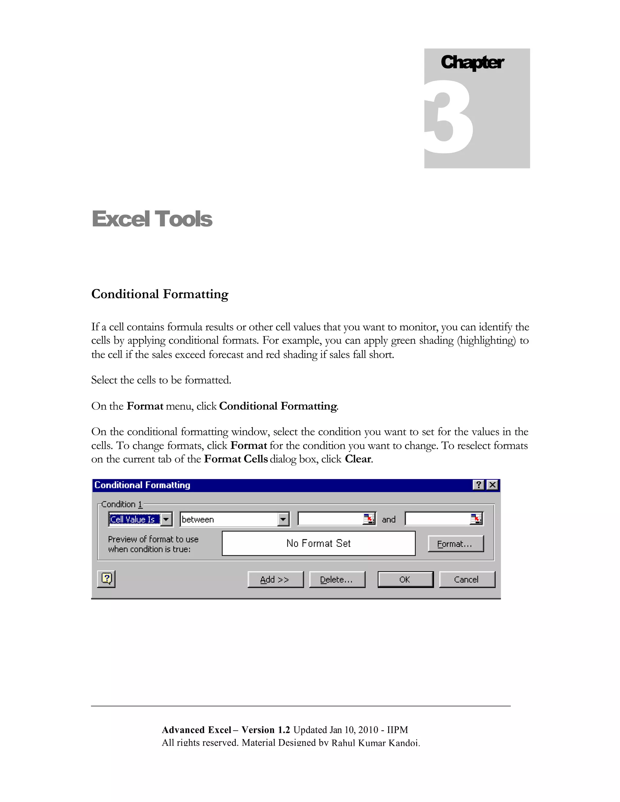 Conditional formatting allows users to format cells differently depending on their values. Users can apply formatting like cell shading to highlight cells where sales exceed or fall short of forecasts. To set conditional formatting, users select the cells to format, specify the formatting conditions, and select formatting options for things like font, border, and fill. Advanced filtering allows users to filter lists to display only rows that meet criteria specified for one or multiple columns, including criteria based on formulas. Users can filter lists in-place or copy matching rows to another location.