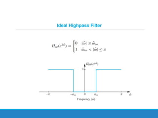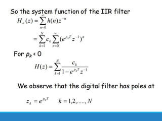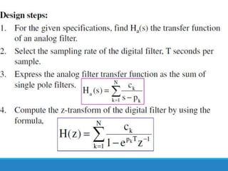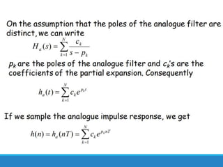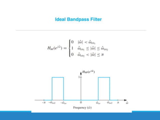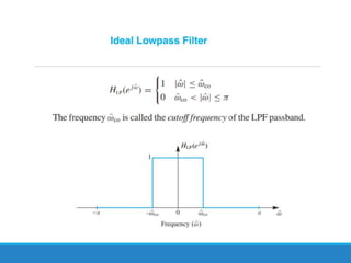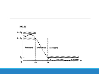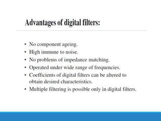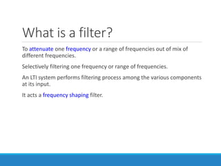 Filters selectively attenuate certain frequency ranges in a signal. They are used widely in electronics, telecommunications, audio/video, and other applications. Filters are classified as analog or digital depending on the signal type. Ideal filters have constant gain in the passband and zero gain in the stopband with linear phase, but practical filters have variable gain and non-zero/non-linear characteristics. Digital filters are further divided into finite impulse response (FIR) filters, which depend only on past inputs, and infinite impulse response (IIR) filters, which are recursive and depend on both past inputs and outputs. IIR filters are designed by first designing an analog filter prototype and transforming it to the digital domain using techniques like impulse invari