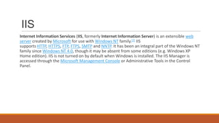 Internet Information Services (IIS) is a web server created by Microsoft for use with Windows operating systems. IIS supports protocols like HTTP, HTTPS, FTP, and SMTP. It includes features like sites, applications, and virtual directories to organize and serve content. IIS can run in either classic or integrated mode, with integrated taking full advantage of newer IIS capabilities. Application pools allow isolating applications from one another for security and stability. IIS includes additional components like connection strings, settings, file types, and directories.