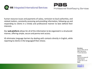 PBS's Integrated International Services (IIS) helps clients bridge gaps and ease pains of international business by providing support for creating, developing, and managing overseas businesses. IIS acts as a single point of contact, dealing directly with local partners or clients' employees abroad, and centralizes consultation on local issues while taking care of regulatory compliance, employment contracts, payroll, accounting, and human resources in a timely, professional manner. The service eliminates language barriers by communicating in English and reporting to clients in their preferred language.