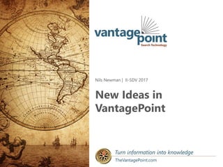 The document discusses the 2017 release of VantagePoint version 10, which features a completely new user interface and improved visualizations, including an enhanced matrix viewer and network maps. It introduces AI capabilities for finding similar records and an autoclassifier that learns from user tagging to classify documents. Users can export visualizations as standalone HTML files and control training features for record classification.