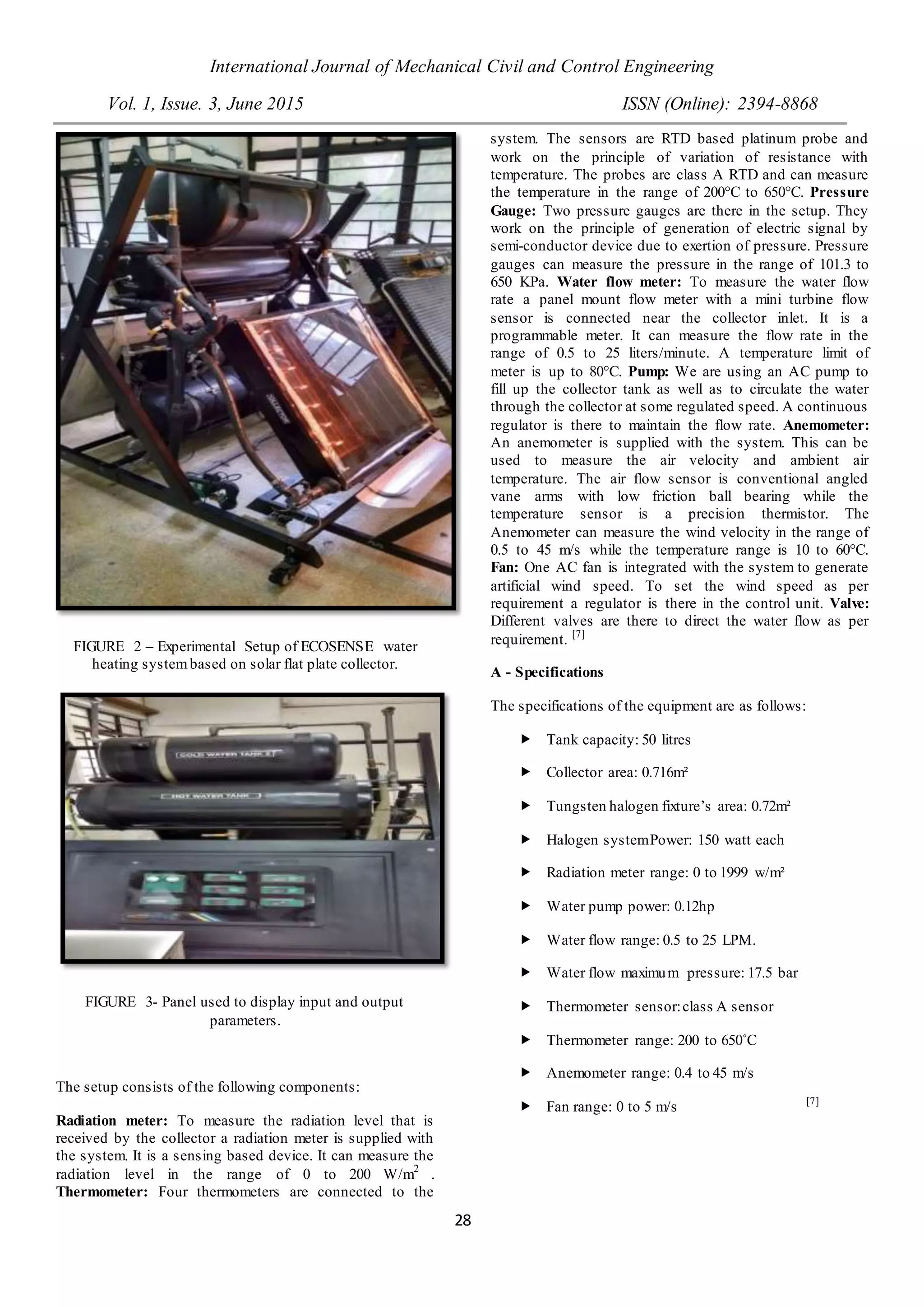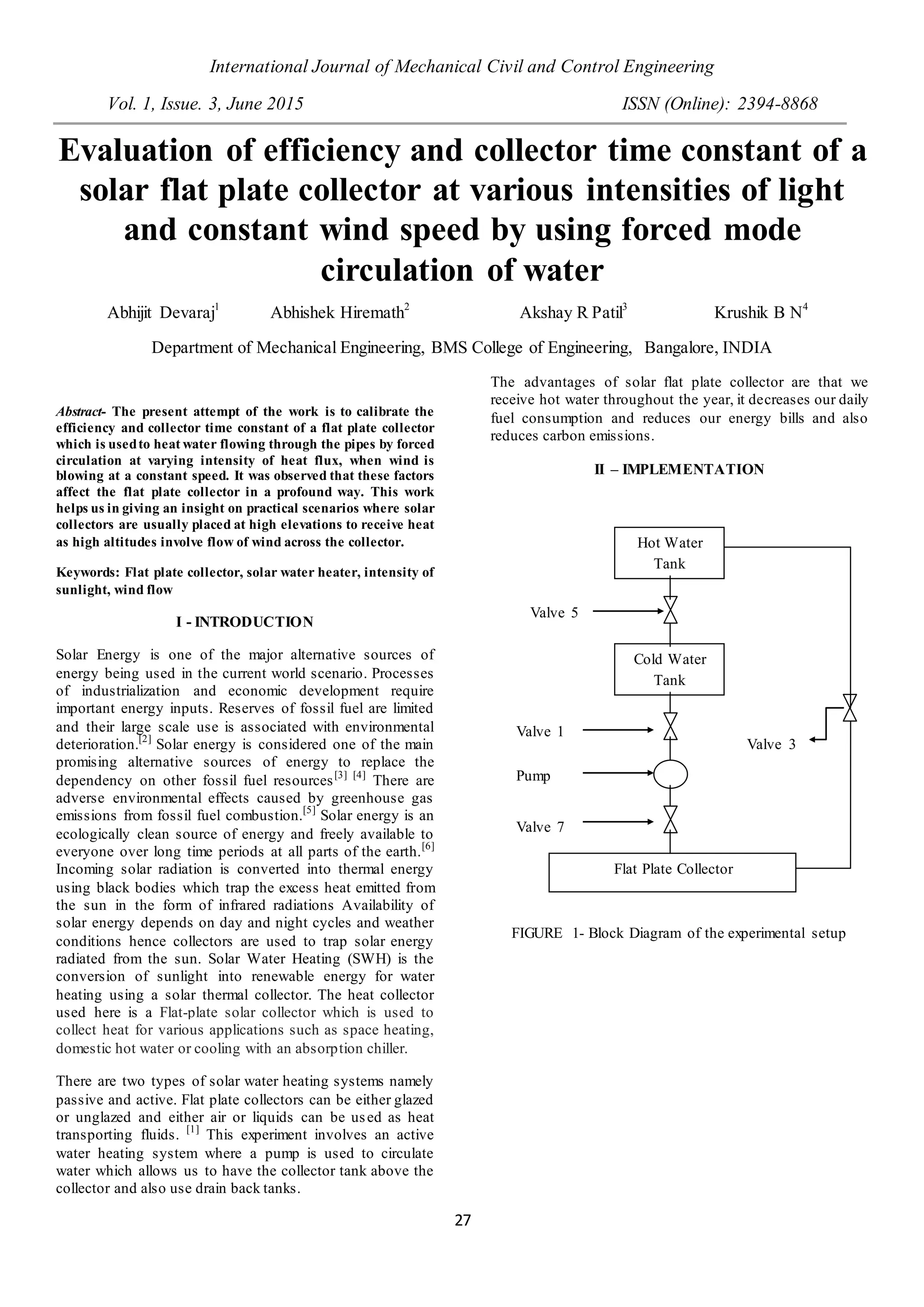 This document describes an experiment conducted to evaluate the efficiency and collector time constant of a solar flat plate collector under varying intensities of sunlight and a constant wind speed. Readings of temperature and flow rate were recorded over time as water was circulated through the collector using a pump under conditions of 100W/m2, 130W/m2 and 160W/m2 light intensity and 5m/s wind speed. The efficiency of the collector decreased over time for each light intensity due to cooling from the constant wind. Graphs of efficiency vs. time showed efficiency decreasing and leveling off over time, indicating the collector reaching steady state conditions. Formulas used to calculate efficiency and time constant are also presented.