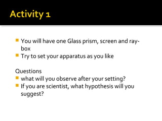 When white light passes through a prism, it will refract and disperse into the seven colors of the visible spectrum - red, orange, yellow, green, indigo, blue, and violet. This is because white light is composed of a mixture of colored lights. To produce a rainbow, the sun light must hit water droplets inside a certain angle so that the light undergoes total internal reflection inside the droplets and is seen by the observer.