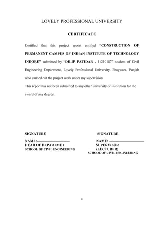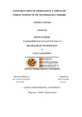 This document provides a project report on the construction of the permanent campus of the Indian Institute of Technology Indore. It was submitted by Dilip Patidar in partial fulfillment of his Bachelor of Technology degree in Civil Engineering. The report details various aspects of the construction process including shuttering, reinforcement, concrete work, finishing work and quality control tests. It provides architectural drawings and photos of the different buildings constructed on campus such as the podium building, hostels, residences and more.