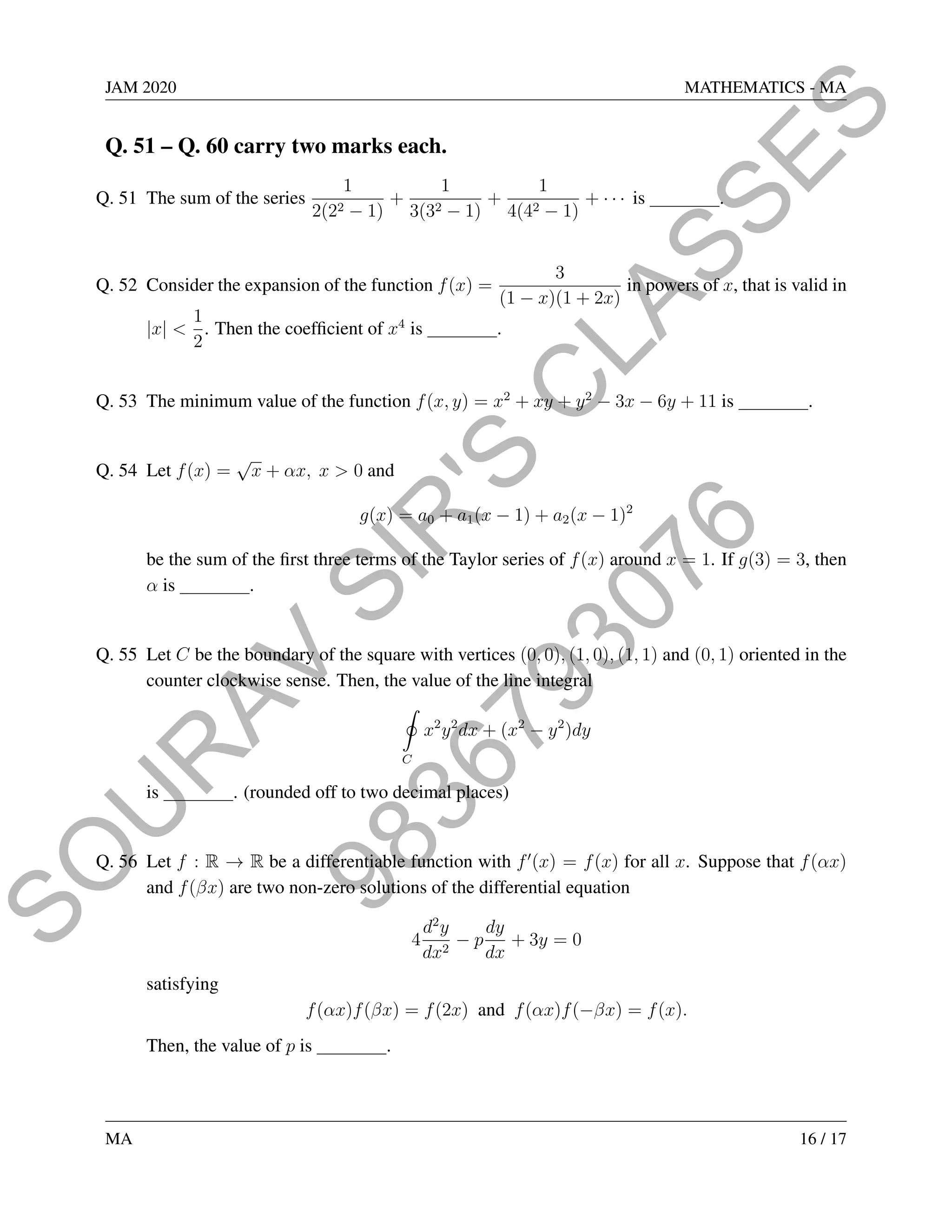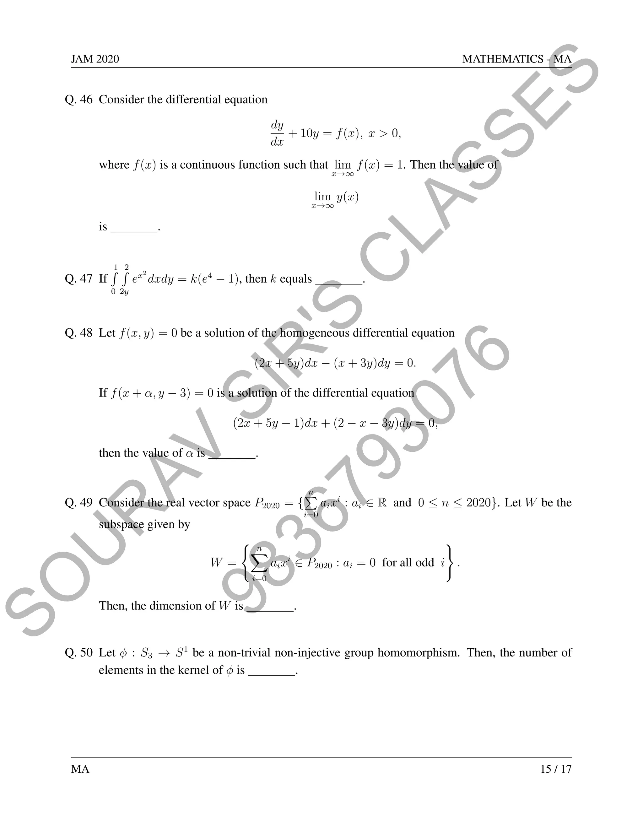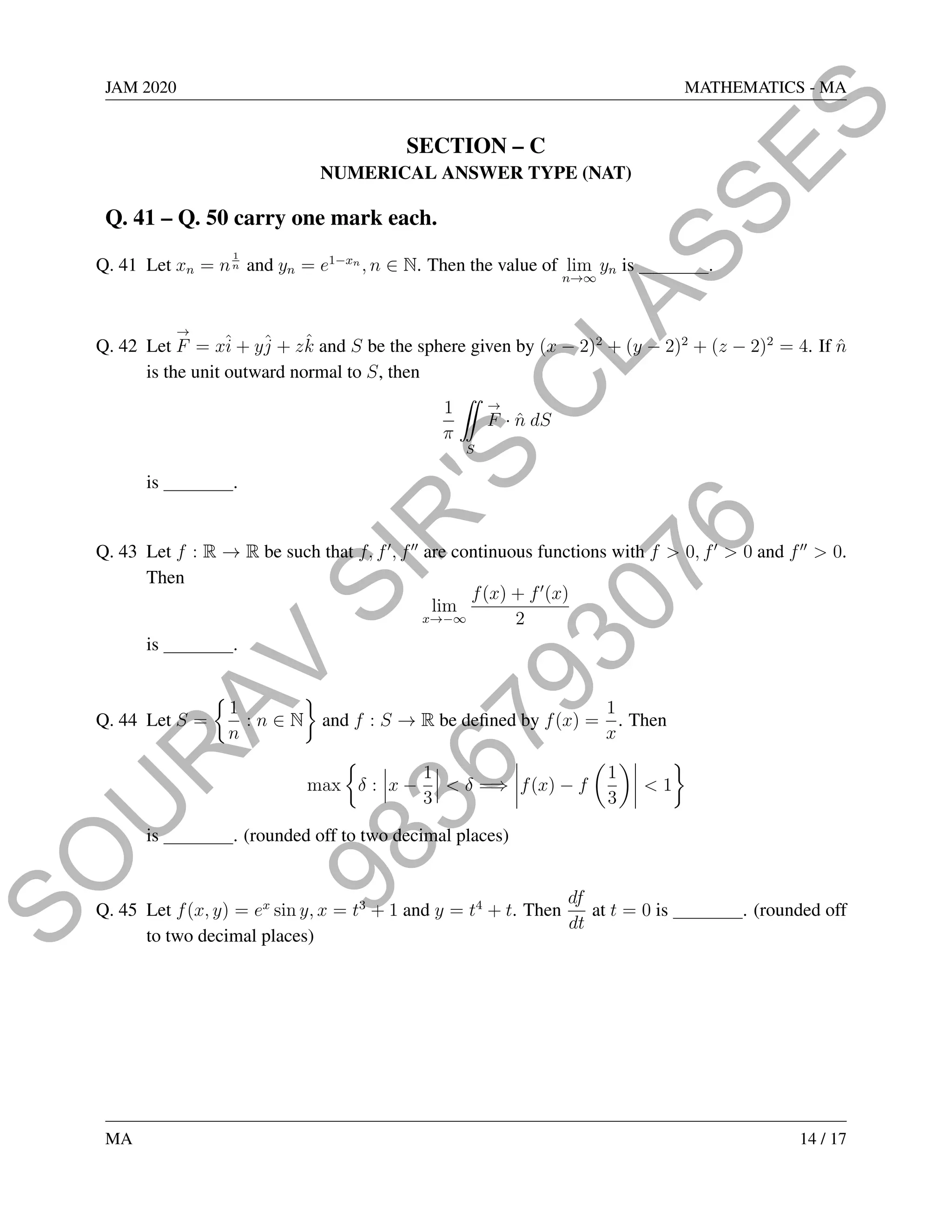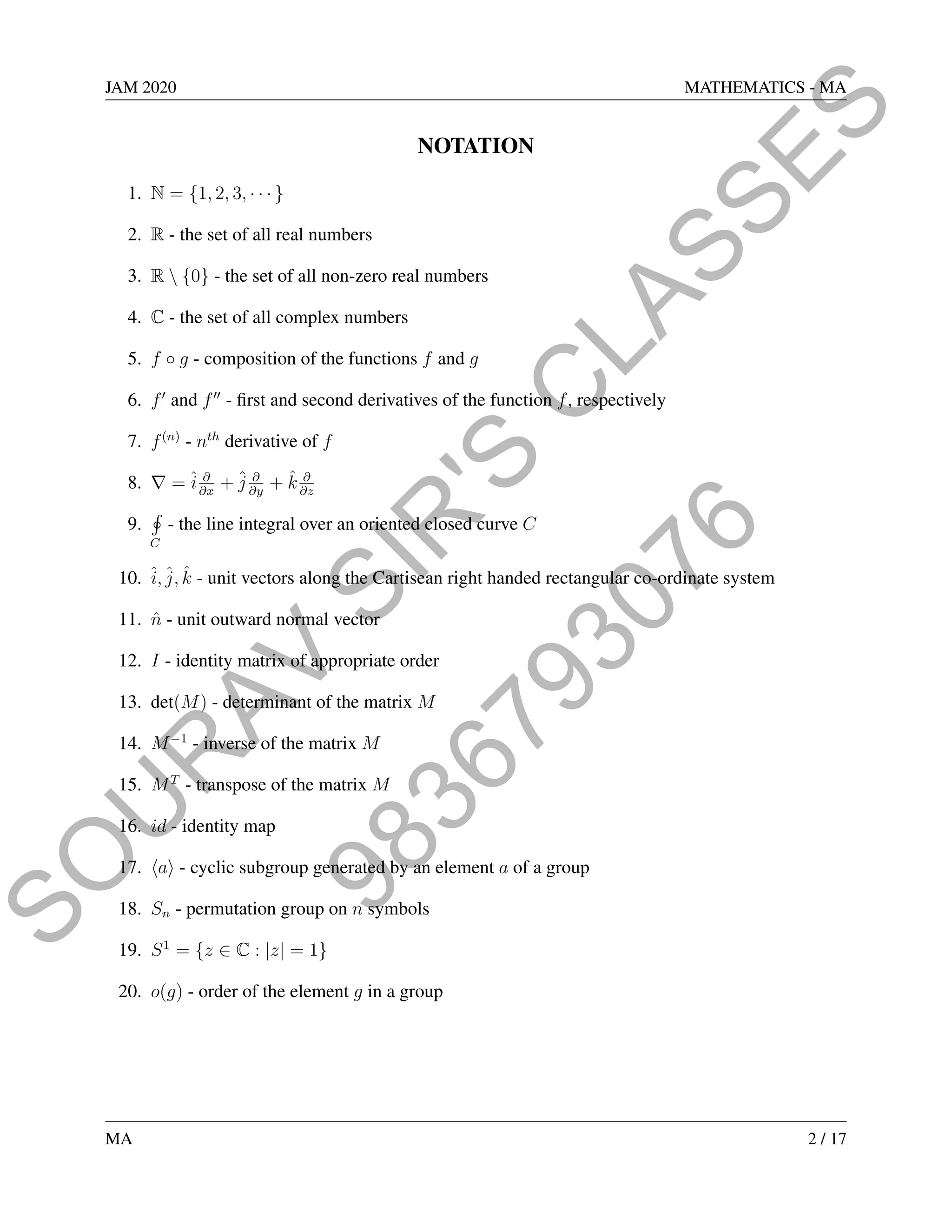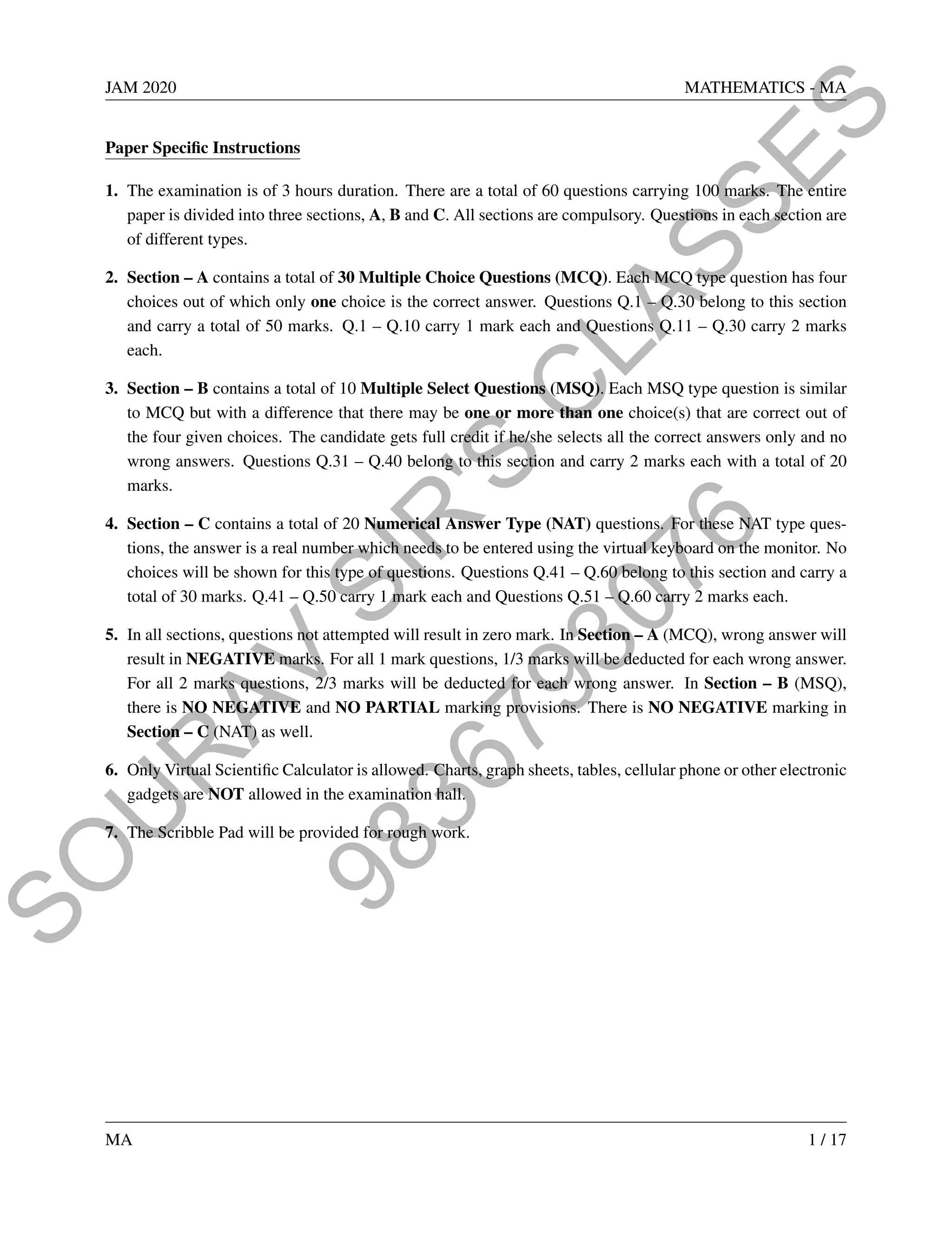 The document outlines the specific instructions for the JAM 2020 Mathematics examination, detailing its 3-hour duration and structure divided into three sections: multiple choice questions (MCQs), multiple select questions (MSQs), and numerical answer type questions (NATs). Each section carries different marks and rules for attempting questions, including penalties for wrong answers in MCQs. Additionally, it specifies permitted materials in the exam and provides mathematical notation used throughout the paper.