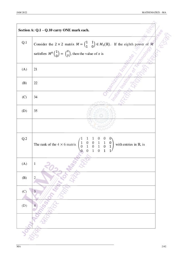 The document consists of a series of mathematical questions categorized into sections, detailing various concepts in mathematics such as matrix operations, vector spaces, convergence of series, differential equations, and algebraic structures. Each question presents multiple-choice answers, testing knowledge on advanced mathematics topics. It serves as an examination or assessment tool for evaluating mathematical understanding, particularly at a graduate level.