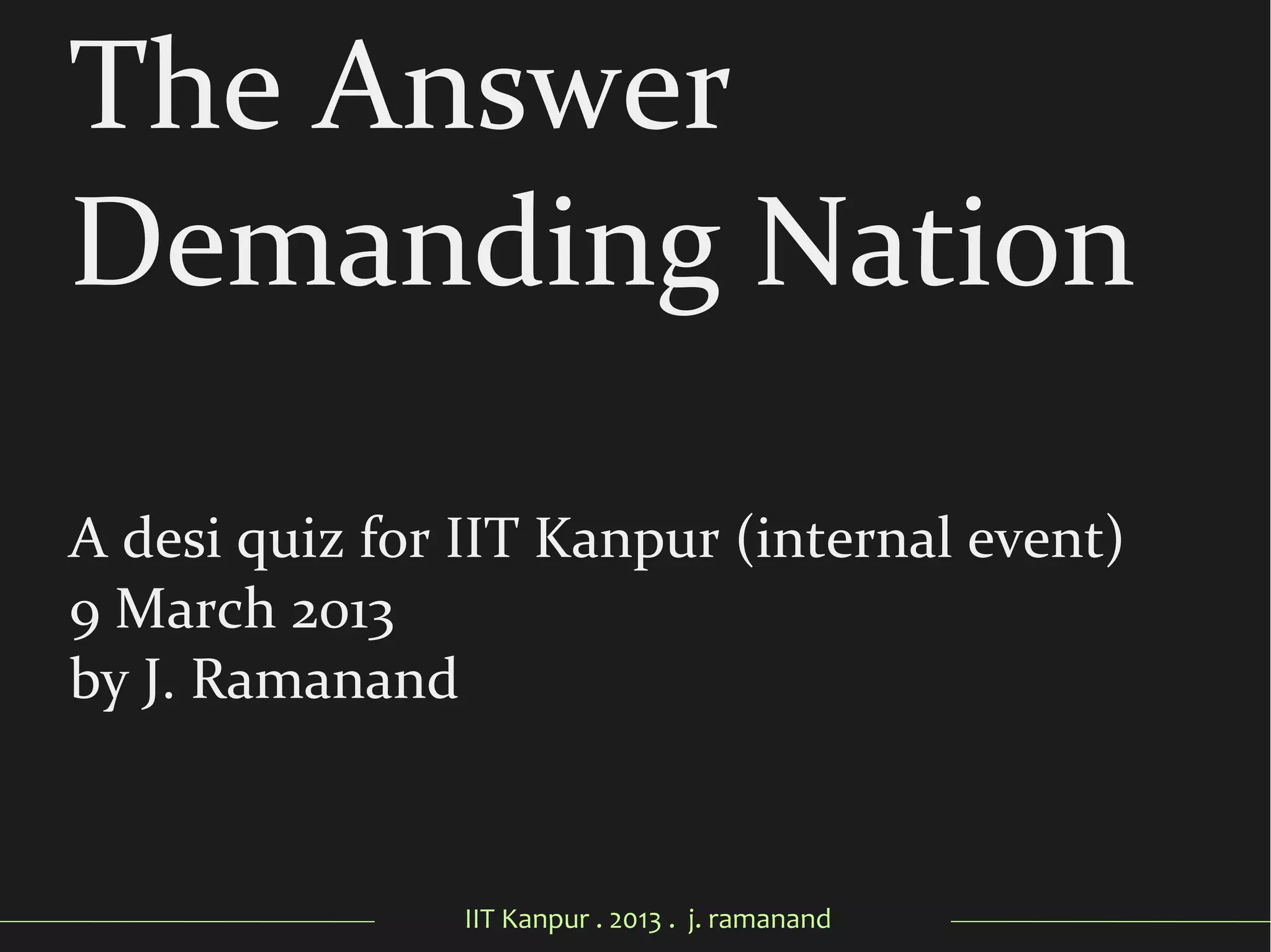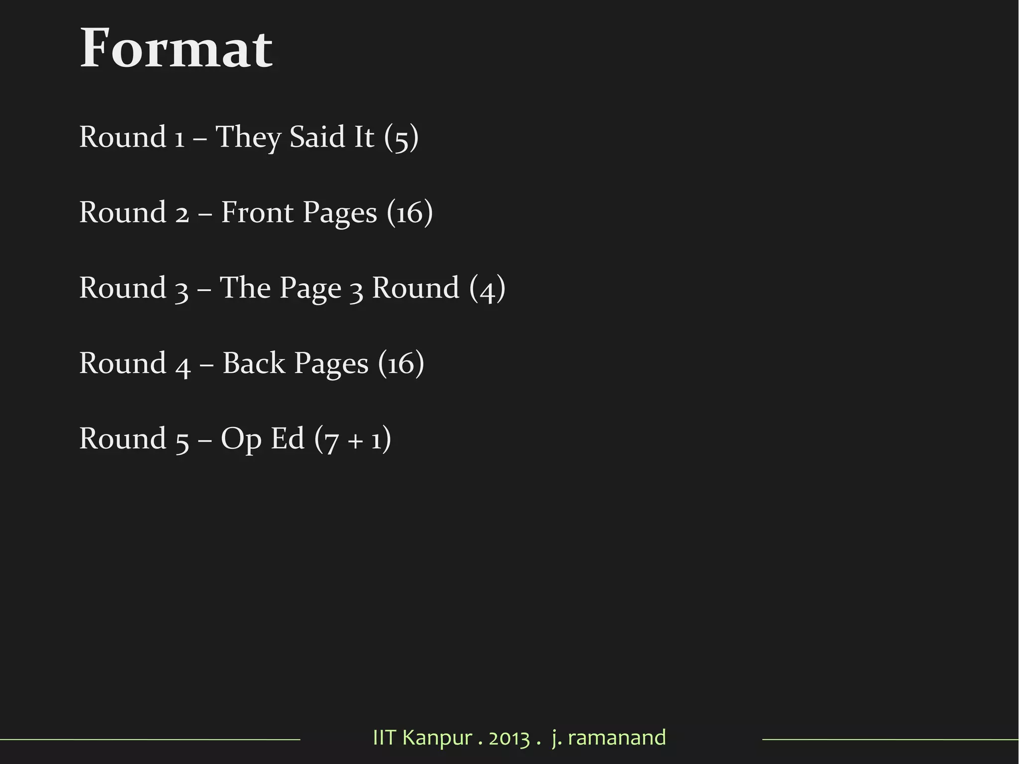 This document outlines the format and questions for a quiz event held at IIT Kanpur on March 9, 2013. The quiz contains 5 rounds covering topics such as identifying political cartoons, answering questions related to newspaper headlines and editorials, sports and entertainment, and Indian history and culture. It provides the questions and answers for each round, with questions ranging from identifying people in political cartoons to the meaning of terms used in different Indian languages.