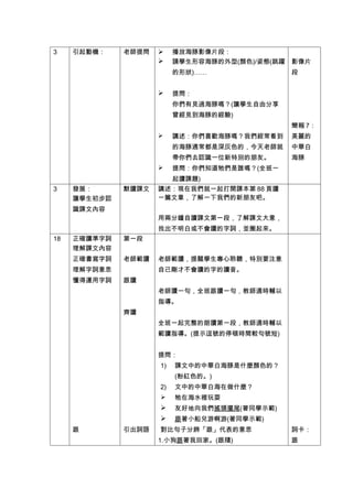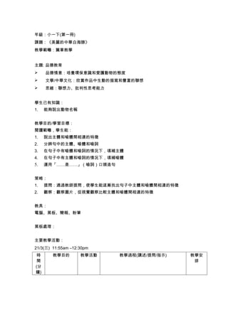 本课程旨在通过阅读《美丽的中华白海豚》来培养学生的环保意识和动物保护态度,同时欣赏文学作品的描写和联想能力。教学目标包括理解句子中的主体和喻体、运用喻词造句,并通过提问和观察来引导学生学习。主要活动包括观看海豚视频、默读课文、朗读生字词以及进行小组讨论和角色扮演。