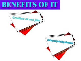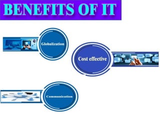 Information technology is the application of computers and telecommunications equipment to store, retrieve, and transmit data. Some common degrees in information technology include BSIT, BSCS, BS Software Engineering, MSCS, MSIT, and MS Software Engineering at both the bachelors and masters level. Studying information technology can prepare students for careers working with computers, networks, cybersecurity, and software development.