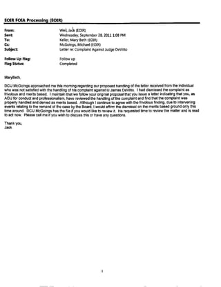 Jack Weil proposes handling a complaint against Immigration Judge DeVitto by issuing a letter finding that the original dismissal of the complaint was proper, despite intervening events in the related case. Michael McGoings has the complaint file and is ready to proceed but requested time to review the matter. Weil asks Mary Beth Keller to call if she wishes to discuss or has any questions.