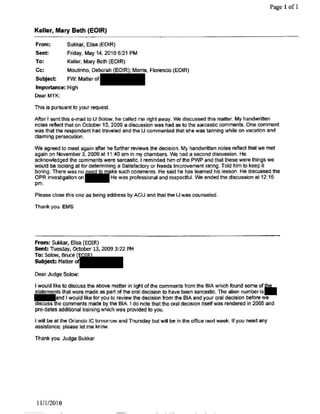 This document contains details of an OPR complaint filed against an immigration judge, including the complaint number, judge's name, nature of the complaint, status, dates, and narrative. The narrative indicates that the BIA found some of the judge's comments in an oral decision to be inappropriate, sarcastic, and gratuitous. It was referred to the ACIJ, who counseled the judge about the comments. The complaint was then concluded as the issue had been addressed.