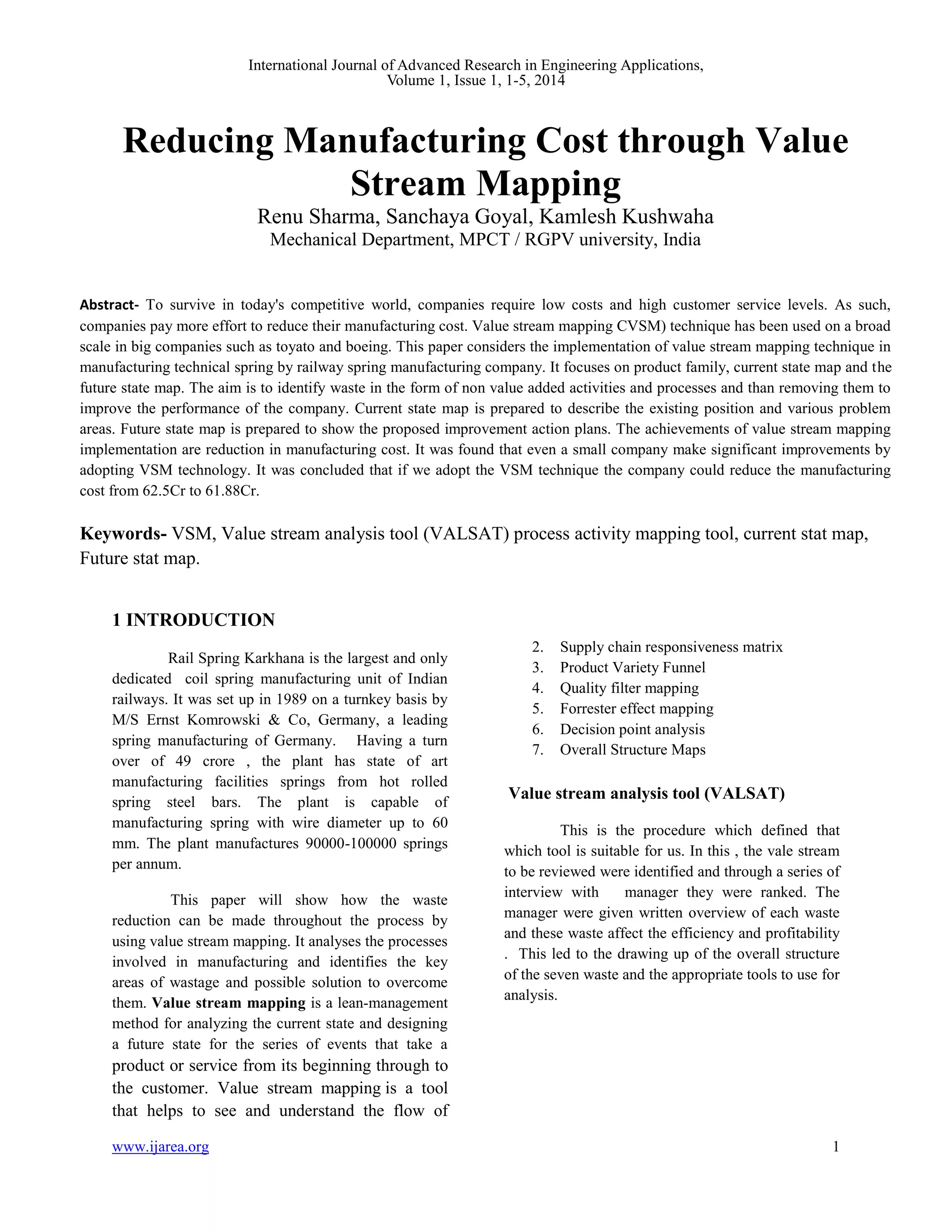 This document discusses the implementation of Value Stream Mapping (VSM) to reduce manufacturing costs at a railway spring manufacturing company in India. The study identifies non-value added activities, develops current and future state maps, and proposes improvements to enhance performance, resulting in a cost reduction from 62.5 crore to 61.88 crore. The findings advocate for procedural and layout changes to streamline operations, showing significant waste reduction without capital investment in new machinery.