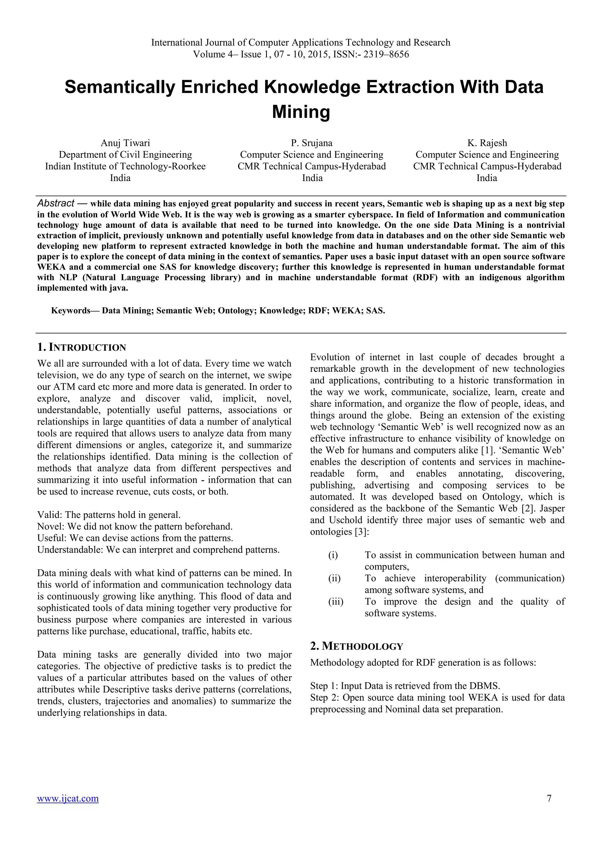 This document discusses using data mining techniques to extract knowledge from data and representing that knowledge in both human-understandable and machine-understandable formats. It uses an input dataset, applies data mining methods like regression using WEKA and SAS, extracts natural language triples about the results, and generates RDF triples to represent the knowledge in a machine-readable format.