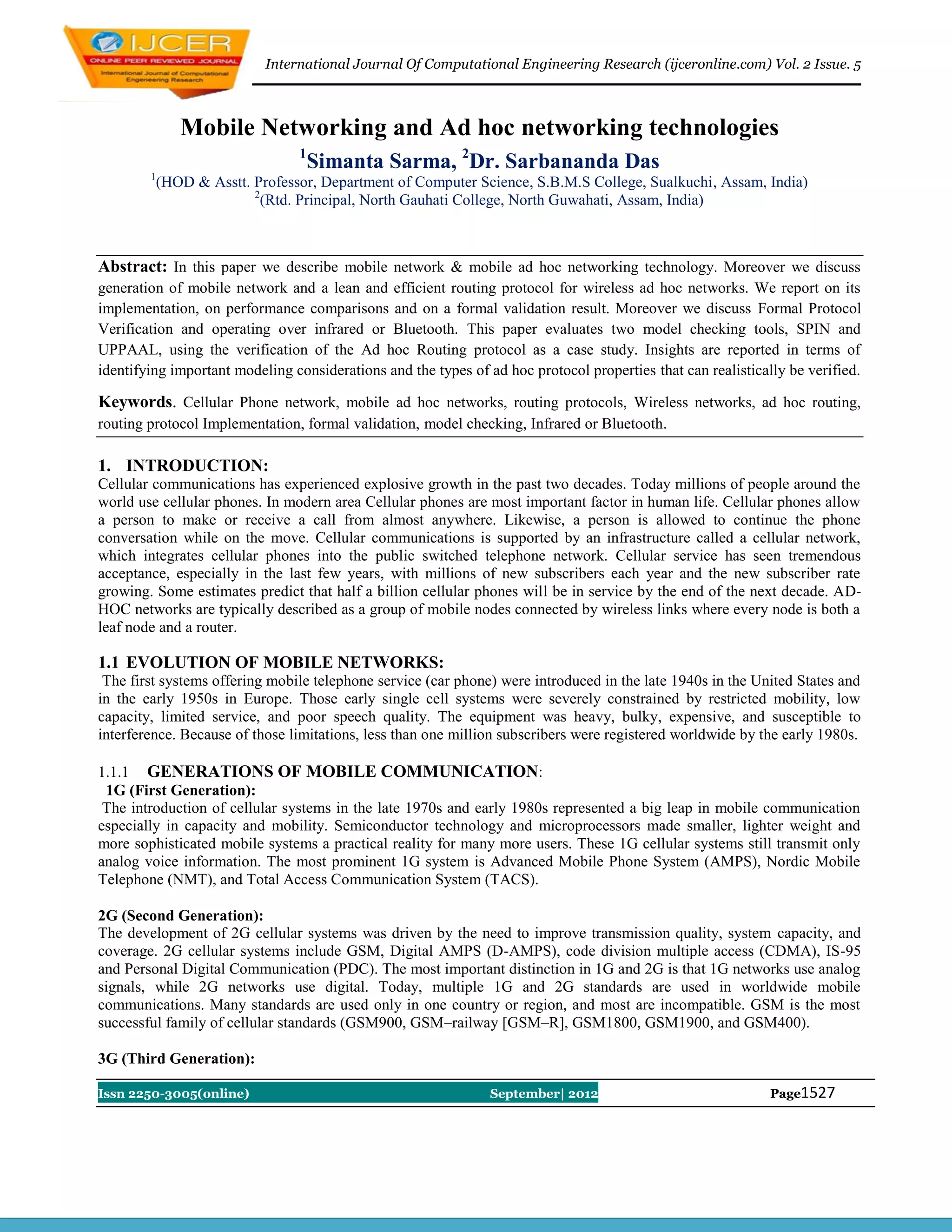 The document discusses mobile networking and mobile ad hoc networking technologies, including their evolution, key routing protocols, and the performance of various communication standards such as 1G, 2G, 3G, Wi-Fi, Bluetooth, Zigbee, and Wimax. It also covers formal validation methods for these protocols using model checking tools and emphasizes the importance of dynamic channel allocation strategies in cellular networks. Insights on the impact of different wireless technologies and their applications in real-world scenarios are provided.
