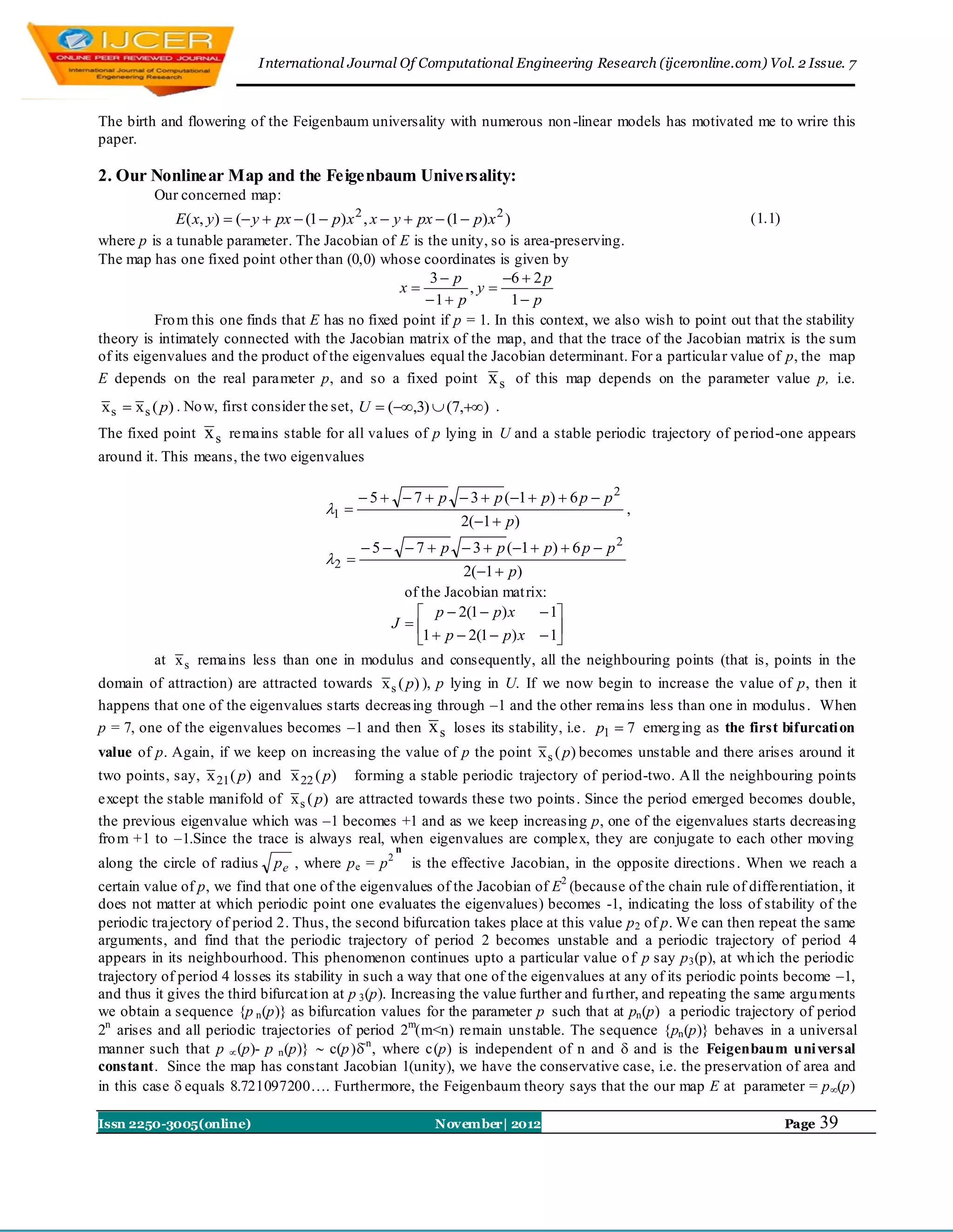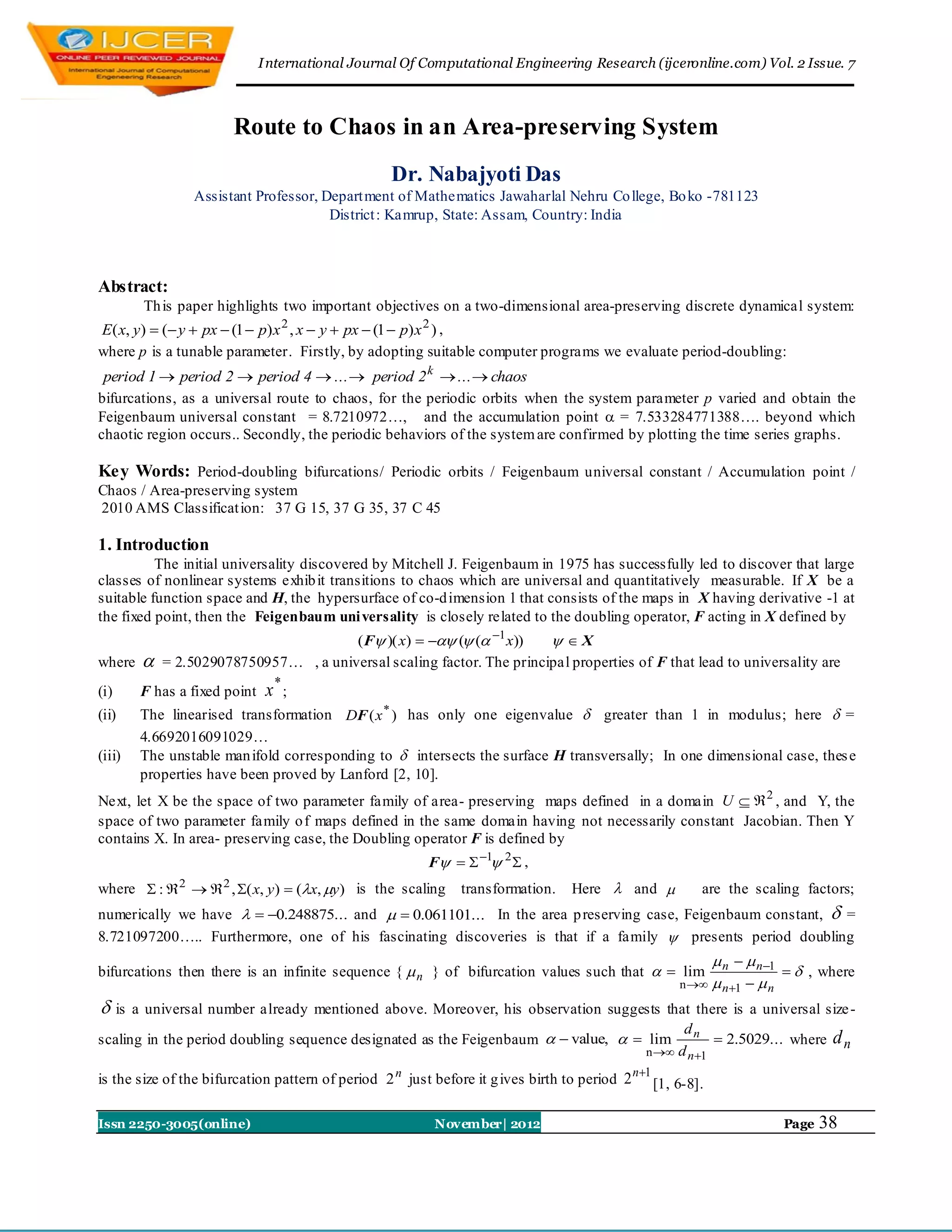 This document discusses period-doubling bifurcations and the route to chaos in an area-preserving discrete dynamical system. It highlights two objectives: 1) Evaluating period-doubling bifurcations using computer programs as the system parameter p is varied, obtaining the Feigenbaum universal constant and accumulation point beyond which chaos occurs; and 2) Confirming periodic behaviors by plotting time series graphs. The document provides background on Feigenbaum universality and describes the specific area-preserving map studied. It outlines the numerical method used to obtain periodic points via Newton's recurrence formula and describes applying this to the map's Jacobian matrix.