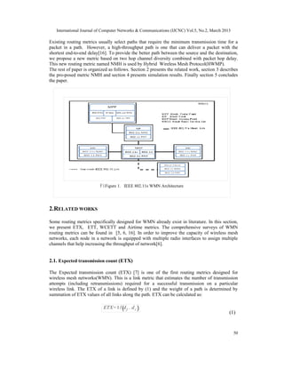 This document summarizes a research paper that proposes a new routing metric called NMH (New Metric for Hybrid Wireless Mesh Protocol) for wireless mesh networks. The paper argues that existing routing metrics do not adequately consider factors like channel diversity, interference, and end-to-end delay. The proposed NMH metric combines two-hop channel diversity and hop delay. Simulation results showed that NMH outperformed WCETT (Weighted Cumulative Expected Transmission Time) in terms of average network throughput, end-to-end delay, and number of flows supported.