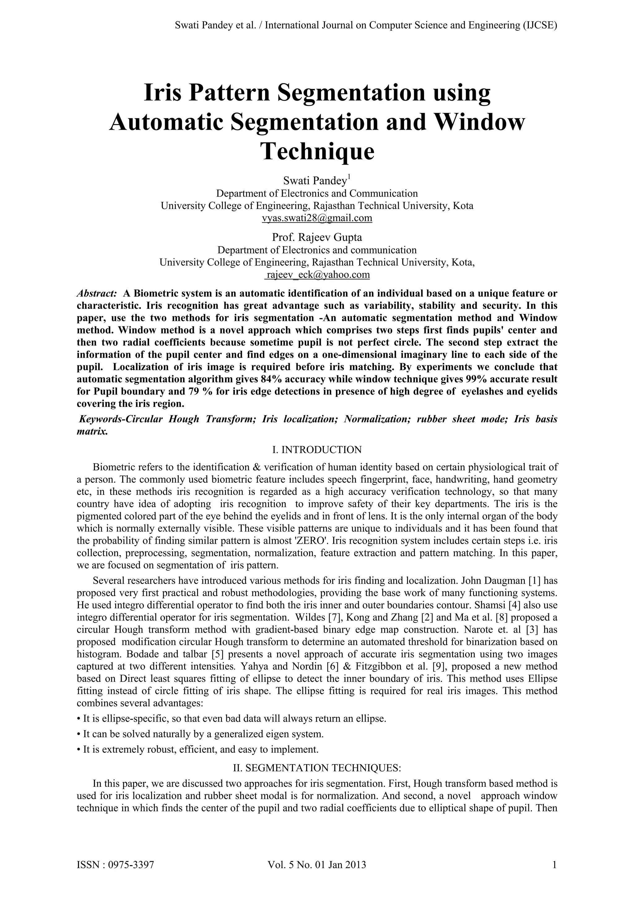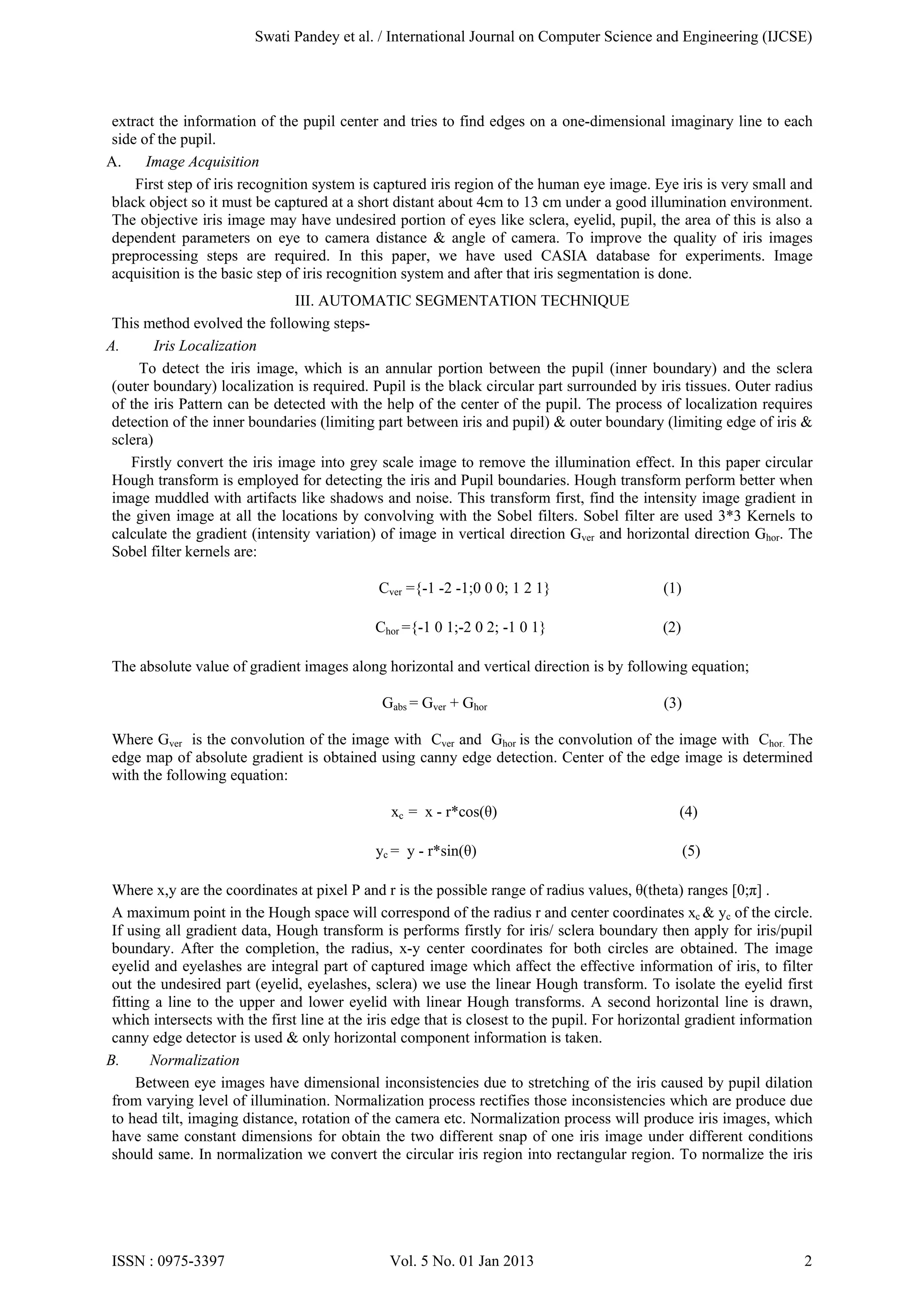 This document summarizes an article that presents two methods for iris segmentation: 1) An automatic segmentation method that uses circular Hough transform to locate the iris boundaries and normalize the iris region using rubber sheet modeling. 2) A window technique that first finds the pupil's center and then detects edges on imaginary lines passing through the pupil center to segment the iris boundaries. Experiments showed the automatic method achieved 84% accuracy for pupil boundary detection while the window technique achieved 99% accuracy for pupil boundary detection and 79% accuracy for iris edge detection.