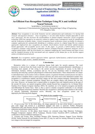 This document describes a face recognition technique that uses a hybrid of principal component analysis (PCA) and an artificial neural network. PCA is used to extract global features of the entire face and local features of the eyes, nose, and mouth regions. These features are used as inputs to an artificial neural network for training and testing. The technique aims to leverage both global and local features for face recognition while reducing computation time compared to local-feature-only approaches.