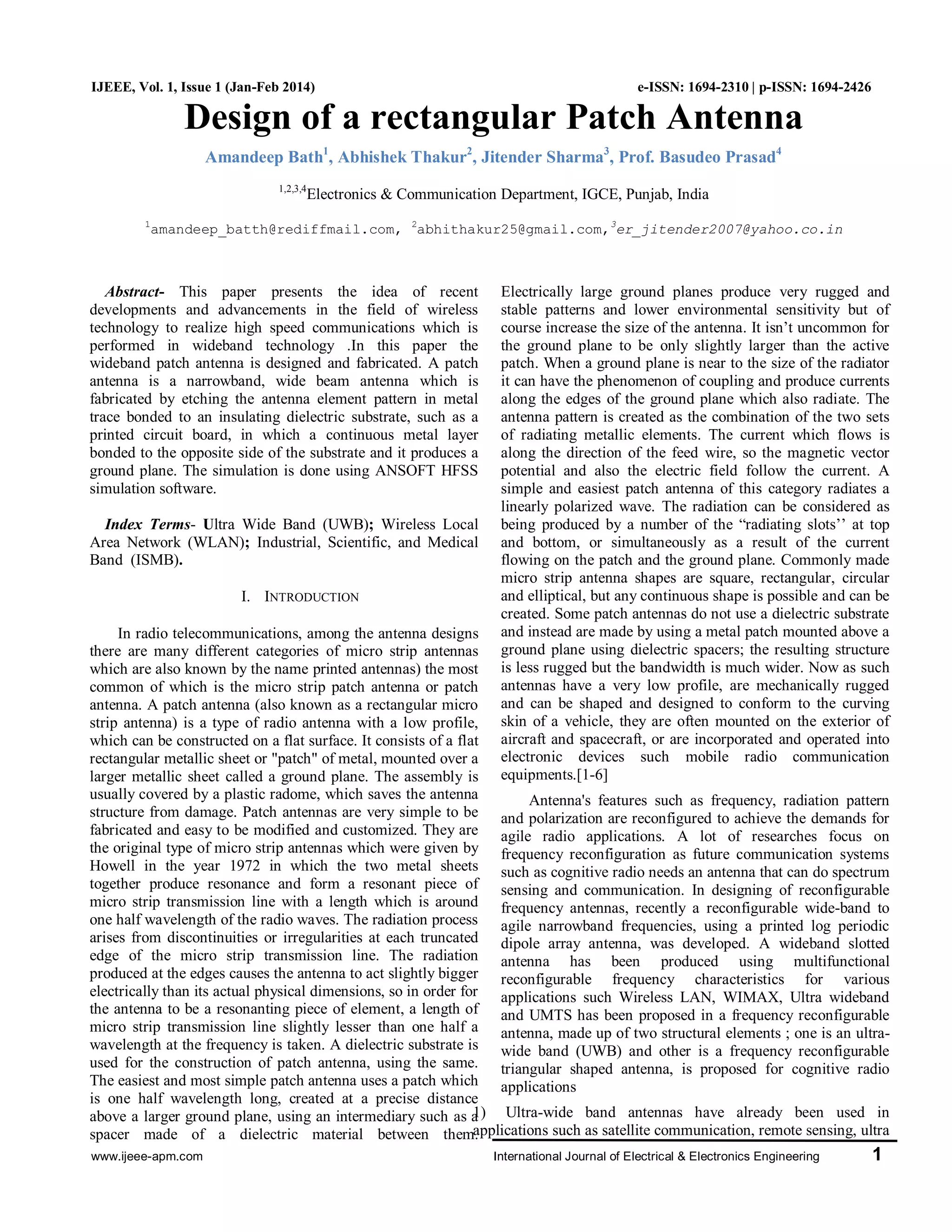This document discusses the design and development of a rectangular patch antenna, emphasizing its significance in achieving high-speed communications within wireless technology. It outlines key characteristics, advantages, and applications of patch antennas, including their use in ultra-wideband technologies, and presents simulation and experimental results that demonstrate their effectiveness. The study concludes with insights on future work, highlighting the potential for enhancements in circularly polarized wideband antennas.