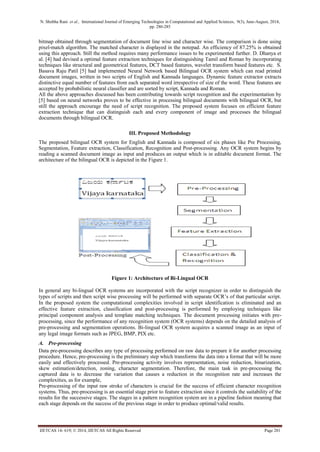 The document presents a bilingual optical character recognition (OCR) system that recognizes printed English and Kannada text, eliminating the need for separate OCR systems. By employing techniques like principal component analysis and connected component analysis, the system achieves a high accuracy of 95%-100% in recognizing bilingual documents. The system is particularly beneficial in multilingual contexts like India, where documents often contain multiple scripts.