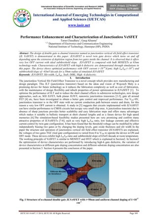 This document summarizes the performance enhancement and characterization of a junctionless vertical slit field effect transistor (JLVeSFET). Key findings from simulations include: