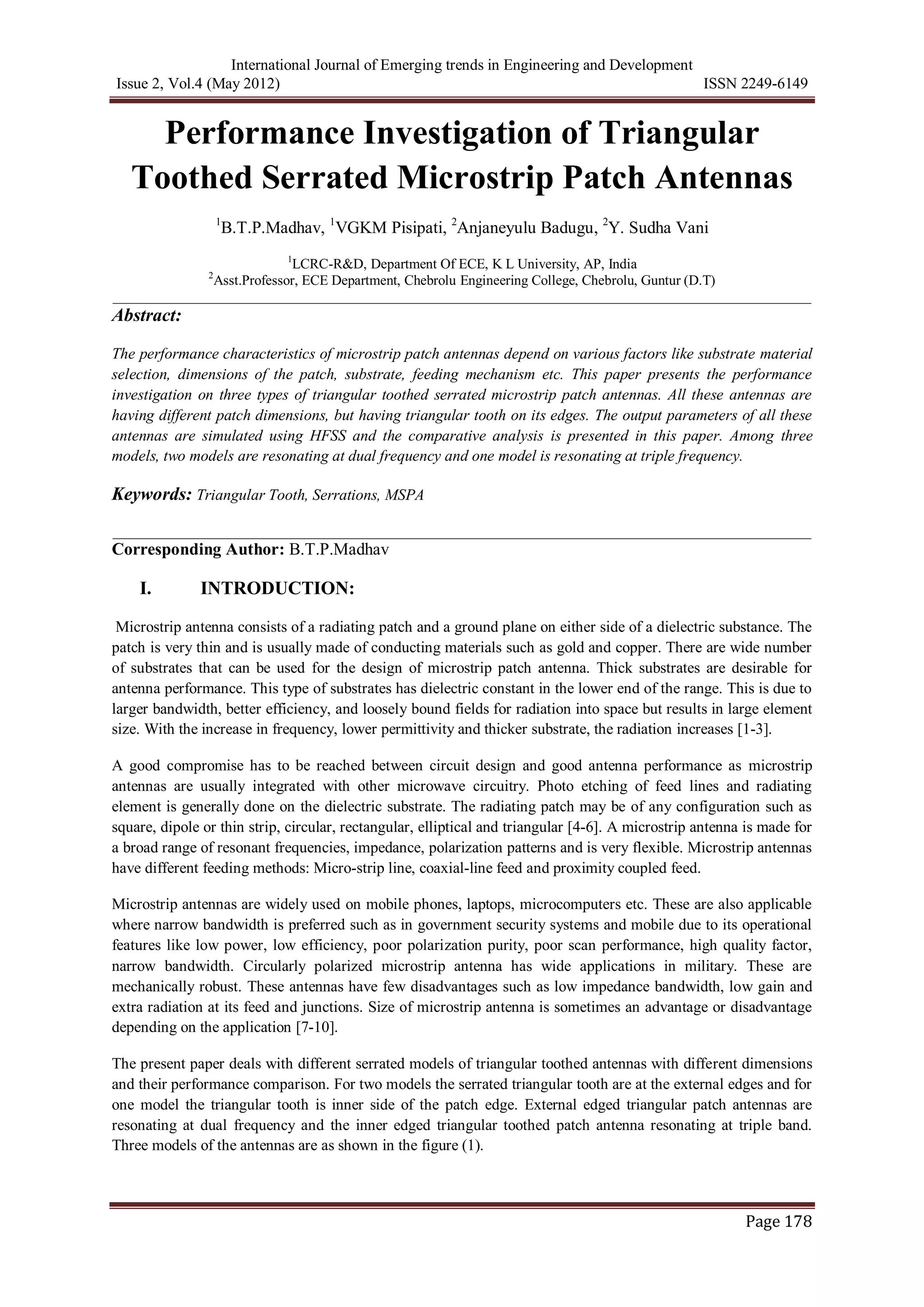 The document summarizes the performance investigation of three types of triangular toothed serrated microstrip patch antennas. The first and second antenna models have triangular teeth on the external edges and resonate at dual frequencies. The third model has triangular teeth on the inner edges and resonates at triple frequencies. Simulation results show the first model resonates at 4.08 GHz and 6.26 GHz, the second at 4.3 GHz and 6.8 GHz, and the third at 3.7 GHz, 5.9 GHz, and 7.5 GHz. Input impedance and radiation patterns are also analyzed, with the third model showing slightly better bandwidth performance.