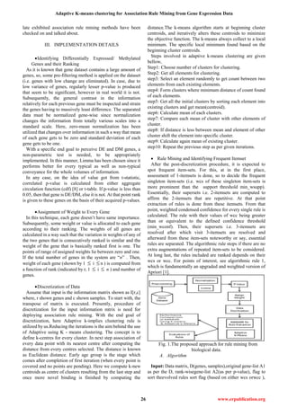The document discusses the application of rank-based weighted association rule-mining (RANWAR) in bioinformatics to identify relationships between genes, utilizing weighted condensed support and confidence for rule ranking. By implementing adaptive k-means clustering, the proposed system enhances the rule mining process, providing more accurate results compared to traditional algorithms like Apriori. The efficiency of the RANWAR algorithm is demonstrated through experimental setups, showcasing its superiority in generating relevant rules from gene expression and methylation data.