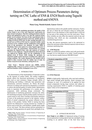 This study focuses on optimizing cutting parameters (feed rate and spindle speed) for turning operations on en8 and en24 steel using a cemented carbide coated tool, aiming to achieve high surface quality and efficient material removal rates. The Taguchi method and ANOVA were employed to determine the influence of these parameters on surface roughness, with cutting speed being the most significant factor affecting surface finish. The findings provide essential insights for further research on machining efficiency and the impact of tool vibrations and cutting forces.