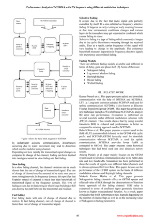 The document discusses a comparison between traditional Orthogonal Frequency Division Multiplexing (OFDM) and Single Carrier Frequency Division Multiple Access (SCFDMA) techniques, highlighting the advantages of SCFDMA such as lower Peak-to-Average Power Ratio (PAPR) and improved power efficiency. It proposes utilizing a Pseudorandom Noise (PN) sequence and an equalizer to enhance the efficiency and reliability of data transmission in SCFDMA systems, demonstrating through various simulations that SCFDMA outperforms traditional OFDM in terms of Bit Error Rate (BER). The results indicate that higher modulation techniques like QAM-16 yield superior performance, with the proposed method showing significant advantages over existing techniques.