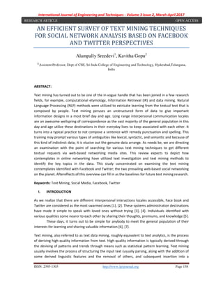 This document surveys text mining techniques used in social network analysis, focusing on Facebook and Twitter. It discusses the significance of extracting structured information from unstructured text data found on these platforms and the challenges posed by ambiguity in informal communication. The review aims to enhance future research in text mining by analyzing methodologies and outcomes from existing studies in this area.