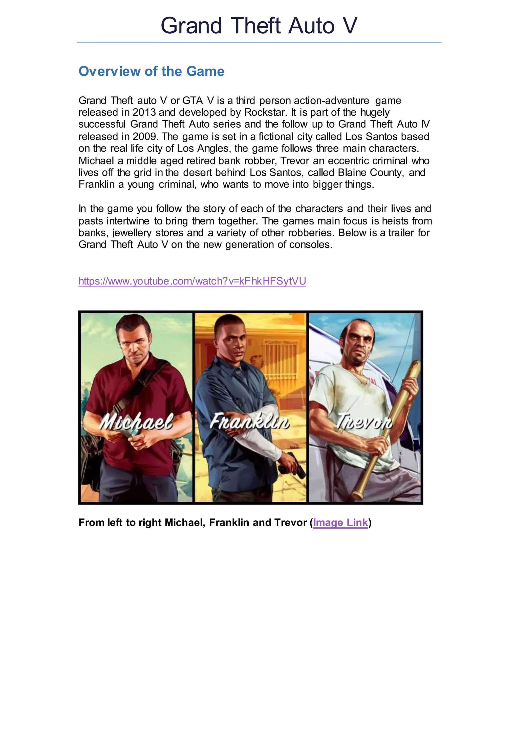 Grand Theft Auto V is an open world action-adventure game released in 2013 that follows three protagonists - Michael, Trevor, and Franklin. The game is set in the city of Los Santos and its surrounding areas. Players can switch between the three characters and complete story missions like heists, as well as engage in optional activities in the huge open world. The game was praised for its graphics, gameplay, and story, becoming one of the highest rated games of all time.